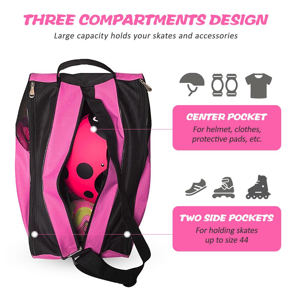 The skate carry bag includes three compartments to provide large capacity for storing your skates, and skating accessories. Features: Tear-resistant oxford cloth with reinforced seams for durability. Three compartments provide large storage space and keep