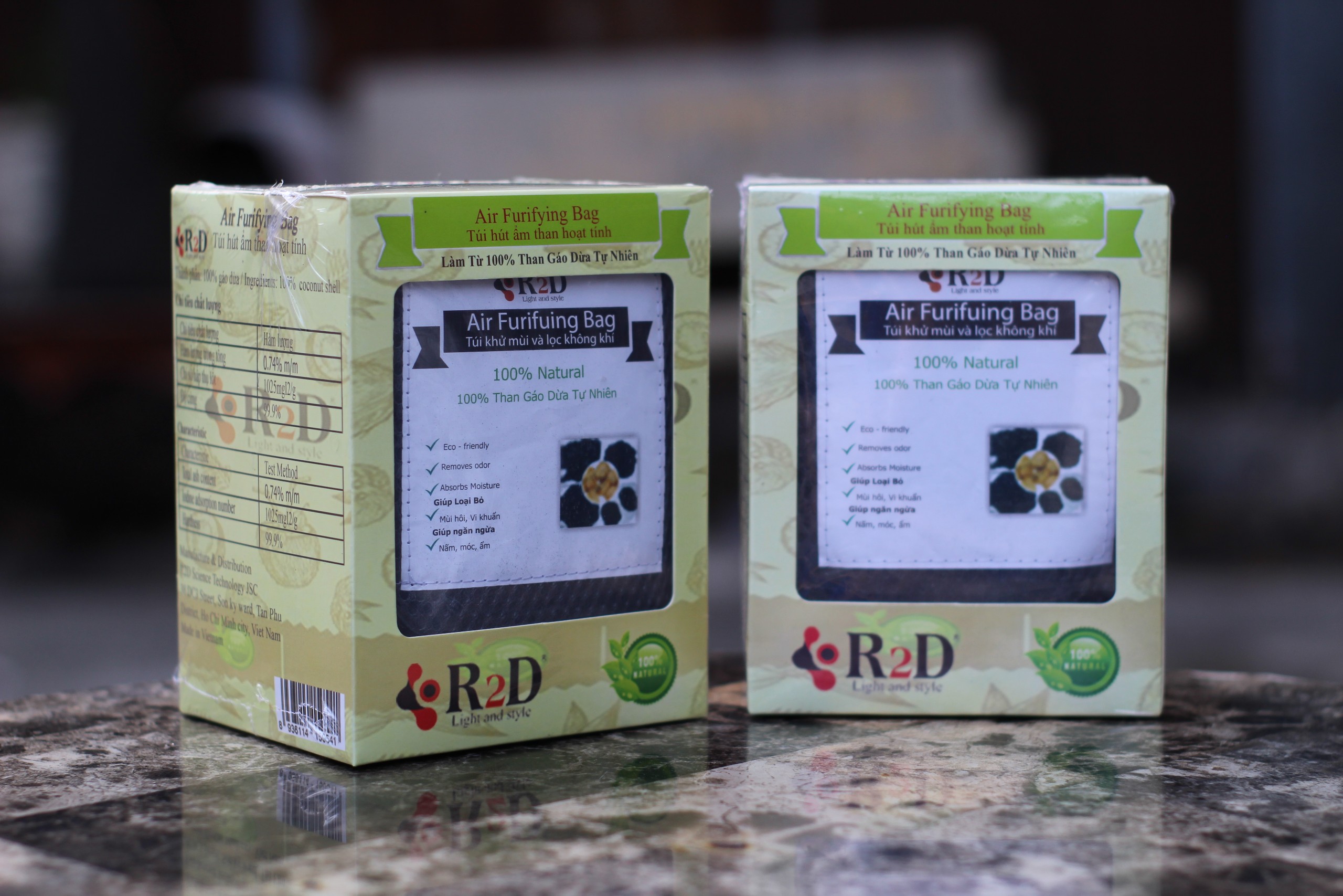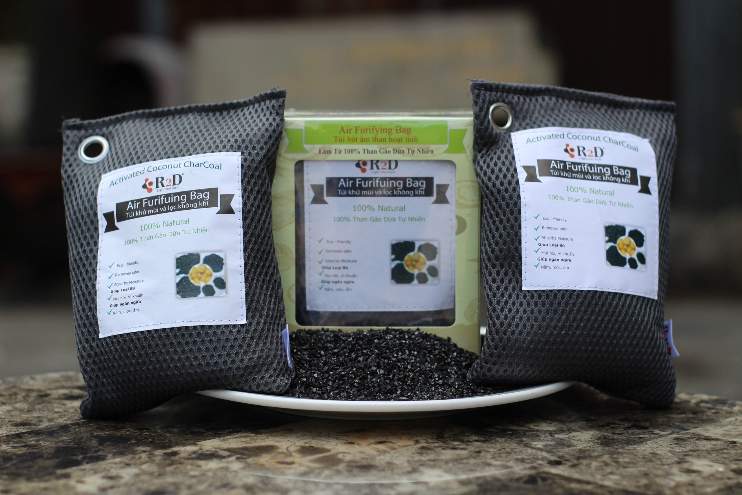 ✨Túi hút ẩm than hoạt tính gáo dừa khử mùi và lọc không khí cho xe hơi chính hãng R2D (hộp 2 túi Lớn)