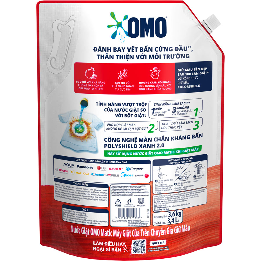 OMO MATIC HƯƠNG CAM & HỔ PHÁCH MỚI CHUYÊN GIA GIỮ MÀU – LỰA CHỌN HOÀN HẢO CHĂM SÓC QUẦN ÁO CHO GIA ĐÌNH OMO Matic lần đầu tiên giới thiệu Hương Cam & Hổ phách ấm áp và sang trọng, lưu hương bền lâu trên quần áo với tính năng khóa hương. Giúp giữ màu sợi vải bền đẹp như mới sau 100 lần giặt với công thức ColorShield gồm chiết xuất lựu đỏ chống oxi hóa, sợi tre ngăn tia cực tím và không chất tẩy. Thơm hương, giữ màu cùng chuyên gia mà vẫn đánh bay vết bẩn cứng đầu ngay lần giặt đầu tiên! Sản phẩm nước giặt OMO Matic Cho Máy Giặt là sự lựa chọn hàng đầu cho máy giặt cửa trên và luôn được khuyên dùng bởi 11 hãng máy giặt hàng đầu thế giới như Aqua, Panasonic, LG, Samsung ƯU ĐIỂM NỔI BẬT