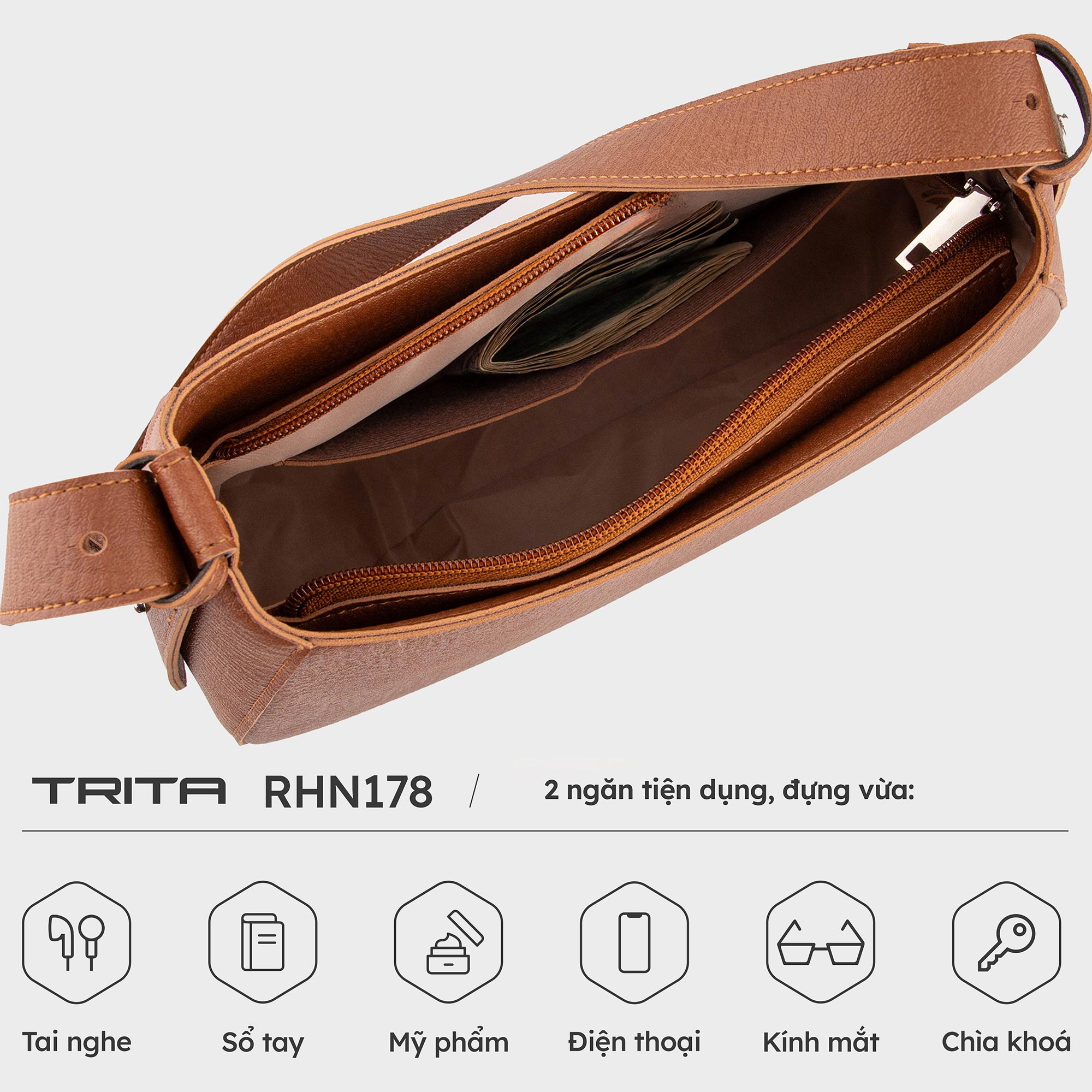 Túi đeo vai da nữ hình thang sang trọng Trita RHN178 được thiết kế form hình thang độc đáo và chất liệu da tổng hợp cao cấp tôn lên thần thái sang trọng của phái nữ. Dây đeo có thể điều chỉnh độ dài cho phù hợp với dáng người hoặc theo sở thích của người dùng. Không gian túi đủ chứa các vật dụng cá nhân cần thiết, phù hợp sử dụng trong nhiều bối cảnh và mục đích khác nhau.