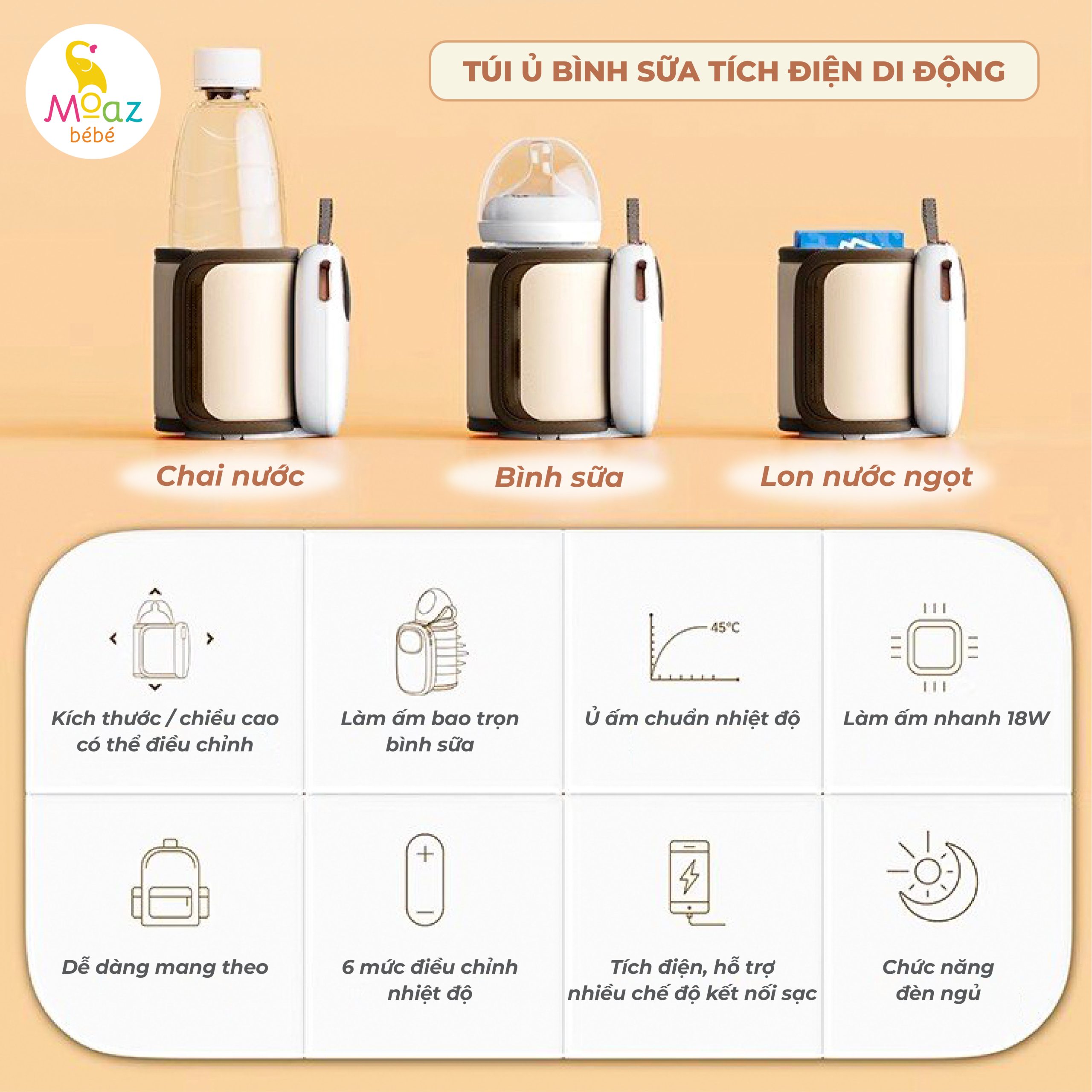 Ưu điểm túi ủ bình sữa tích điện di động Moaz MB 081-Thiết kế nhỏ gọn, sang trọng-Chất liệu da PU và nhựa ABS an toàn, chịu nhiệt tốt-Màn hình led thông minh hiển thị chức năng, thiệt độ, dung lượng p...