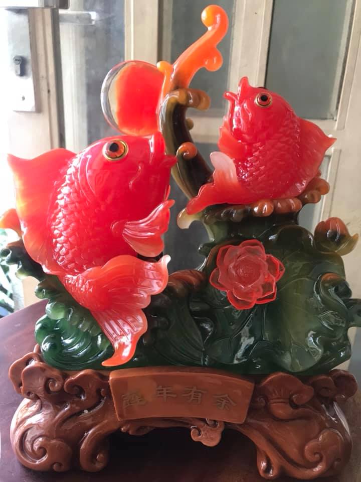 ✨Tượng 2 Cá Chép Đỏ Ngồi Vẫy Đuôi đế gỗ có hoa sen đồng tiền ở trên may mắn tài lộc ý nghĩa có cá có tiền Size 36cm x đk 30cm x Sâu 17cm hợp mệnh hoả mệnh thổ ạ