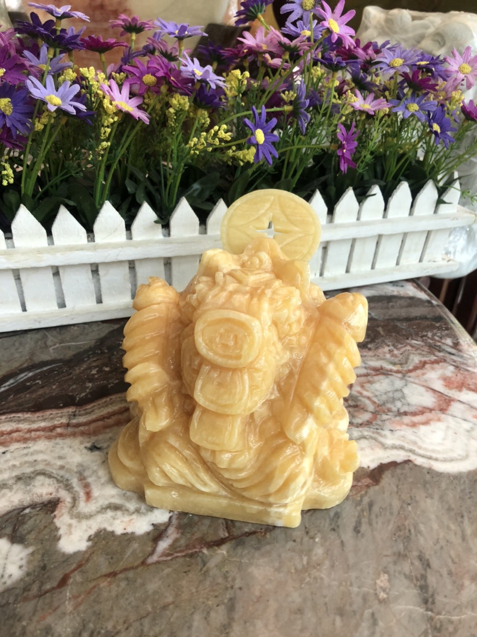 Chất liệu: Đá cẩm thạch vàng cà rốt Kích thước: Dài 20 cm x Rộng 18 cm x Cao 17,5 cm Khối lượng: 9,3 kg