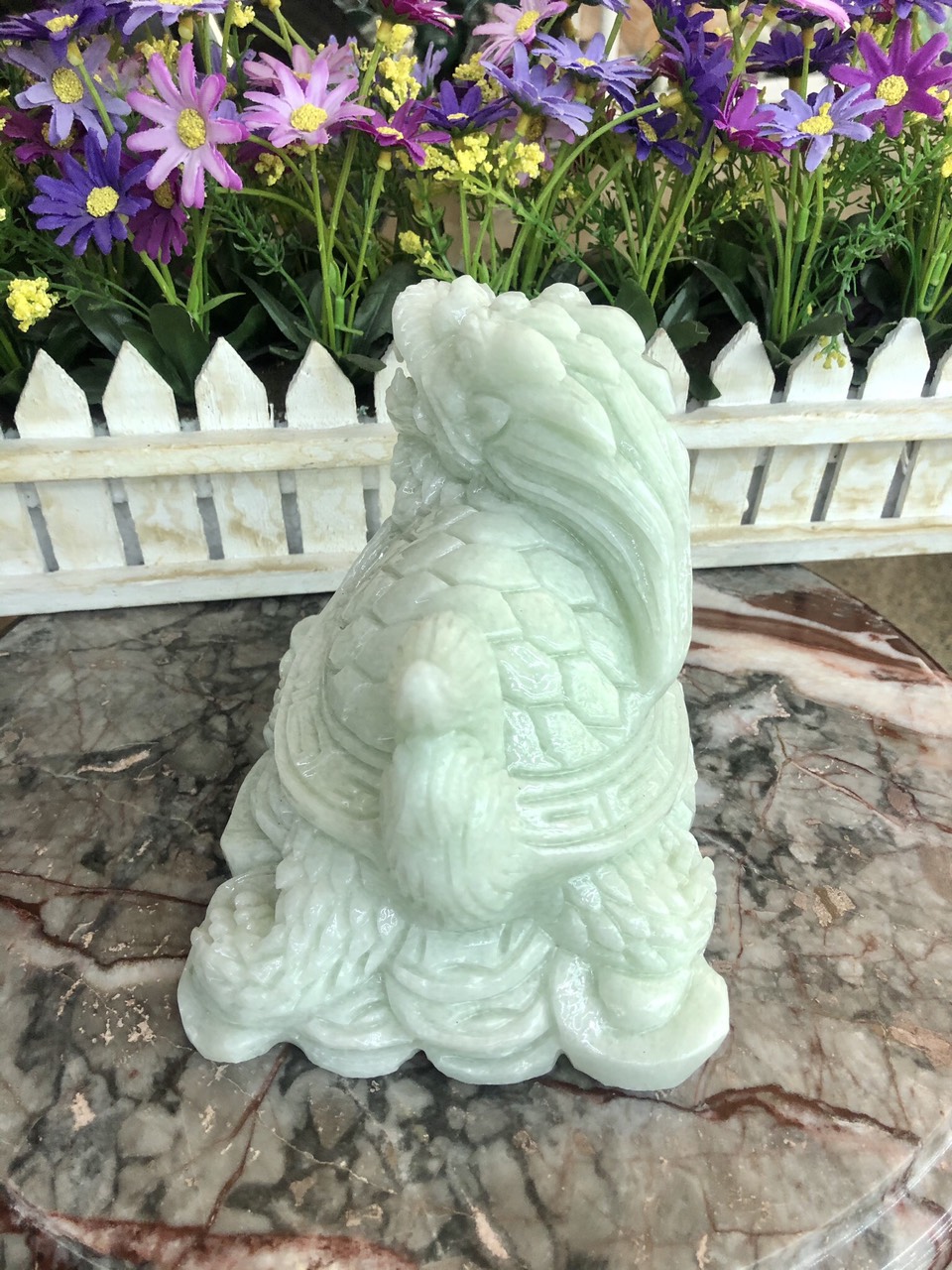 Kích thước: Dài 11 cm x Rộng 7 cm x Cao 15 cm Khối lượng: 3,6 kg Chất liệu: Đá trắng Vị trí đặt: Bàn làm việc, Phòng khách, Cửa hàng, Công ty, Bàn thờ.