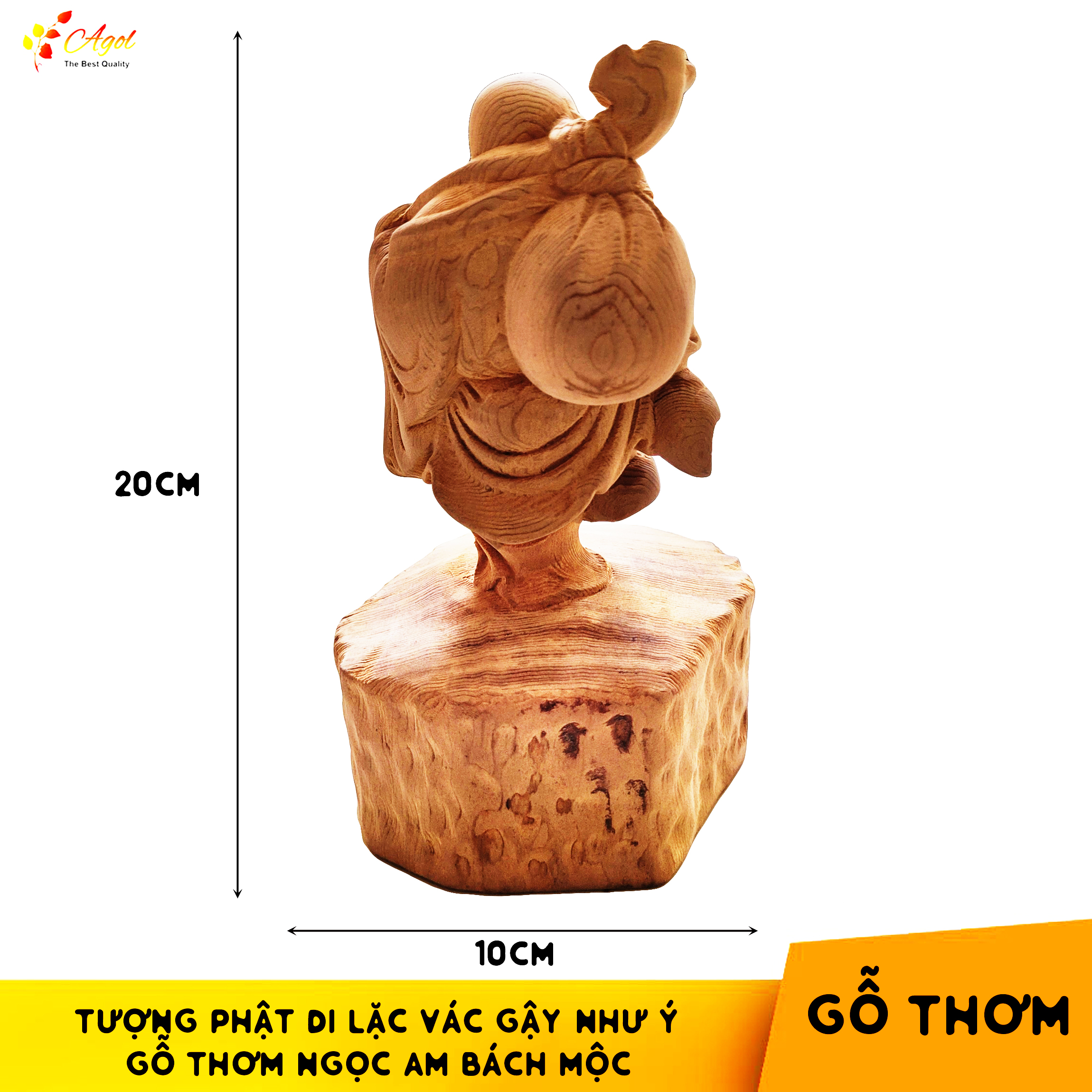 Tượng Phật Di Lặc Vác Như Ý Gỗ Thơm Bách Mộc Ngọc Am - Hàng cao cấp cực thơm   Tượng Di Lặc vác như ý được chế tác từ chất liệu gỗ thơm liền khối, tác phẩm có kích thước cao 20 ngang 10 sâu 8 cm.  Tác phẩm có kích thước vô cùng hợp lý, nhỏ gọn, giúp gia chủ có thể bày trí tại nhiều nơi trong phòng khách như trên kệ ti vi, tủ đồ, trên đôn, … hoặc bày trí tại phòng làm việc. Sản phẩm thích hợp làm quà tặng, tân gia, cúng dường Chùa, mang lại sự may mắn và bình yên Tượng Phật có bố cục vô cùng cân đối, điểm nhấn của tác phẩm là hình tượng Đức Di Lặc nở nụ cười an nhiên, phúc hậu bước đi với dáng vẻ vô cùng an nhiên, tự tại. Hình dáng Phật Di Lặc được khắc họa với dáng vẻ mập mạp càng làm lên giá trị của tác phẩm. Tay trái của Phật Di Lặc cầm Như Ý, chi tiết này cũng được chế tác vô cùng cẩn thận, tạo nên sự khác biệt của tác phẩm. Chiếc túi Càn Khôn được chế tác tròn trịa, cân đối, hài hòa với tổng thể của tác phẩm. Có thể thấy, tác phẩm Tượng Phật Di Lặc vác như ý gỗ thơm được khắc họa không quá nhiều chi tiết nhưng lại khiến người xem bị cuốn hút và mang đến cảm giác gần gũi, thoải mái, thân thiện. Chất Gỗ   Ngọc am là loại gỗ thuộc tứ đại hương mộc: Hoàng Đàn, Ngọc Am, Bách Xanh, Xá Xị. Gỗ Ngọc am là loại gỗ có mùi thơm rất dễ chịu.  Tên gỗ là: Ngọc am (Ngọc là báu vật, am là ngôi chùa nhỏ). Vậy nên, người ta tin đây là loại gỗ có khả năng trừ tà. Trong dòng gỗ thơm, Ngọc am quý hiếm chỉ sau trầm hương, chơi Ngọc am chuẩn đẹp thể hiện được đẳng cấp của gia chủ.  Cách bảo quản : Tránh ánh sáng mặt trời chiếu vào thường xuyên Nếu trưng bày quý khách có thể đặt trong tủ kính nơi tránh ẩm mốc và côn trùng Sau thời gian dài để vệ sinh có thể dùng nước ấm để lau chùi nhằm bảo vệ sản phẩm tốt hơn   Các sản phẩm được gia công bởi các bậc thầy thợ thủ công có tay nghề cao tại làng nghề và chất lượng gỗ rất tốt Hiện nay, gỗ Ngọc am chủ yếu ở các tỉnh phía bắc. Hà Giang được xem là thủ phủ của gỗ Ngọc am. Thời tiết càng khắc nhiệt gỗ càng thơm và cứng chắc. Gỗ còn lại chủ yếu là các khúc lũa, gốc đã chết nhiều năm, cây ngọc am còn lại rất rất ít. Người dân vùng cao thường đi đào, bới để tìm những mẩu, khúc cây còn sót lại. Mối và các loại côn trùng khác đều sợ mùi Ngọc am nên không bao giờ ăn loại gỗ này. Dù gỗ ngọc am có bị chôn dưới đất hay dưới lòng sông nhiều năm thì mùi thơm vẫn còn. Do nguồn gốc cây gỗ kiểm tra kỹ và đảm bảo nhất nên sẽ có thẻ lên tuyết cho các tác phẩm nếu bảo quản đúng cách Tuyết là gì? Trên gỗ sẽ mọc lên những cây nhỏ li ti màu trắng tinh như tuyết, nhỏ như sợi mì chính, cứng, dài tầm 1 đến 2 ly, nhìn rất đẹp mắt. Những cây này chính là tinh dầu từ gỗ chảy ra mà hình thành. Tuyết thường mọc tại các góc của tượng, rất dễ gãy. Các tác phẩm có hương thơm đặc trưng dòng gỗ quý nên sẽ không sơn PU mà để mộc để quý khách hàng kiểm tra  Ngọc Am để mộc mùi thơm sẽ nhiều hơn so với đã PU Ngọc Am là 1 trong 2 loại cây duy nhất có khả năng tạo tuyết pha lê, lớp tuyết này nếu dùng đèn pin soi vào sẽ lóng lánh màu của cầu vồng, vì vậy những sản phẩm tâm linh được chế tác từ loại gỗ Ngọc Am lên tuyết này luôn tạo cảm giác linh thiêng hơn rất nhiều so với những chất liệu khác. Ý nghĩa phong thủy to lớn Tượng Phật Di Lặc vác như ý được chế tác vô cùng đơn giản, không quá nhiều chi tiết nhưng cũng đem đến những ý nghĩa phong thủy vô cùng độc đáo. Phật Di Lặc bước đi dáng vẻ an nhiên, tự tại, miệng nở nụ cười vô lo, vô nghĩ mang ý nghĩa cho gia chủ cuộc sống thoải mái, hạnh phúc, vui vẻ. Chiếc Như ý được chế tác vô cùng tỉ mỉ, như ý còn được gọi là vương trượng Như Ý, là một trong những vật phẩm phong thủy tượng trưng cho quyền lực. Sự xuất hiện của Như Ý đem đến ý nghĩa cho gia chủ công việc thuận lợi, mọi điều được như ý. Một chi tiết cũng vô cùng ý nghĩa nữa ở đây chính là túi Càn Khôn, nơi được cho là có thể chứa đựng mọi thứ. Túi Càn Khôn mang ý nghĩa cho gia đình một cuộc sống ấm no, đủ đầy. Các chi tiết nhỏ đều được các nghệ nhân gia công vô cùng tỉ mỉ và tinh xảo Toàn bộ sản phẩm được điêu khắc nguyên khối gỗ không ghép và thực hiện thủ công bằng tay chuẩn xác   Với những chi tiết được chế tác vô cùng tỉ 