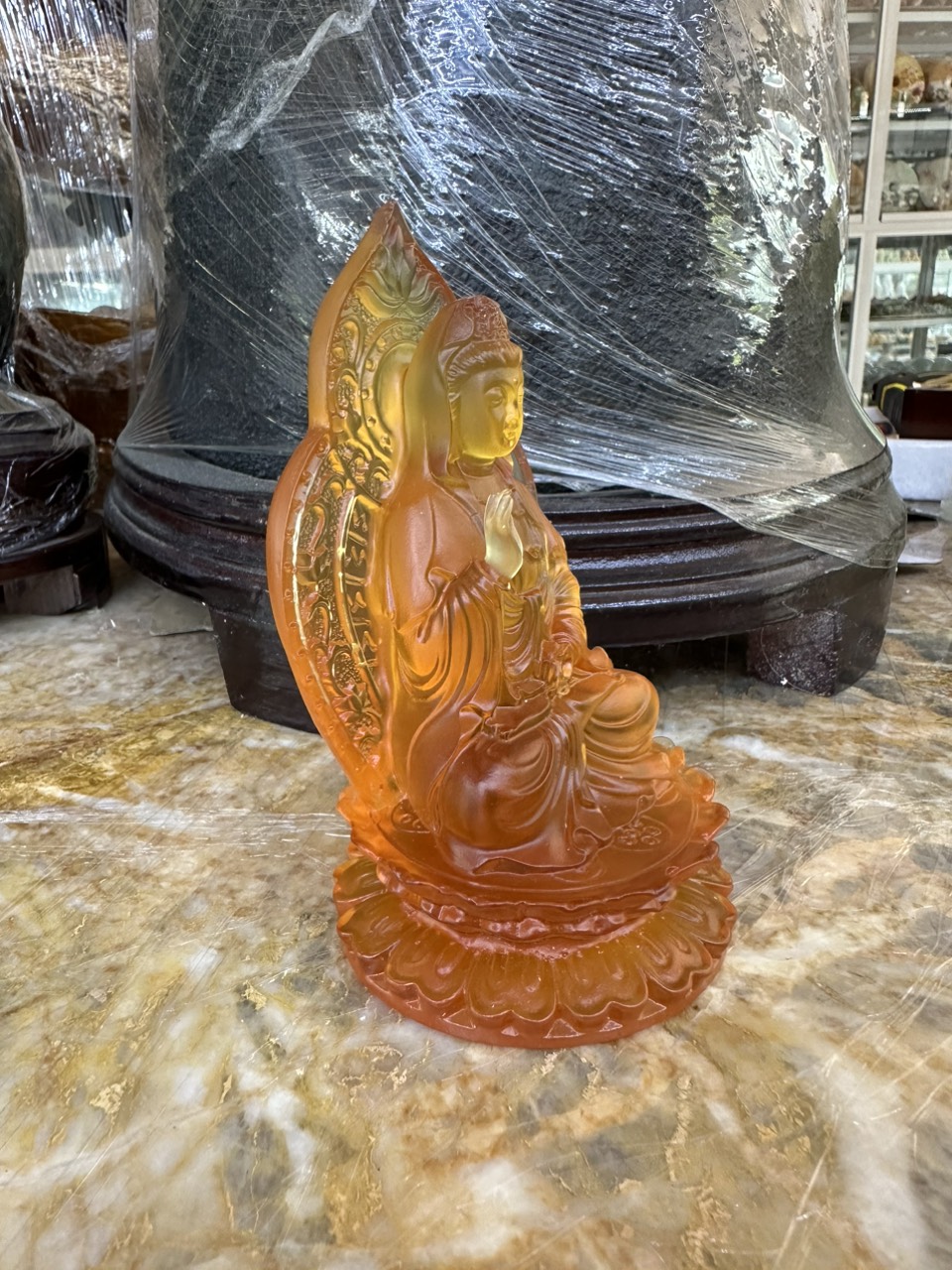 TƯỢNG PHẬT BÀ QUAN ÂM Mới ĐÁ LƯU LY VÀNG ĐẬM ĐỂ TRONG XE HƠI hoặc BÀNSize cao 12cm x đk 7cm x đế 5cm