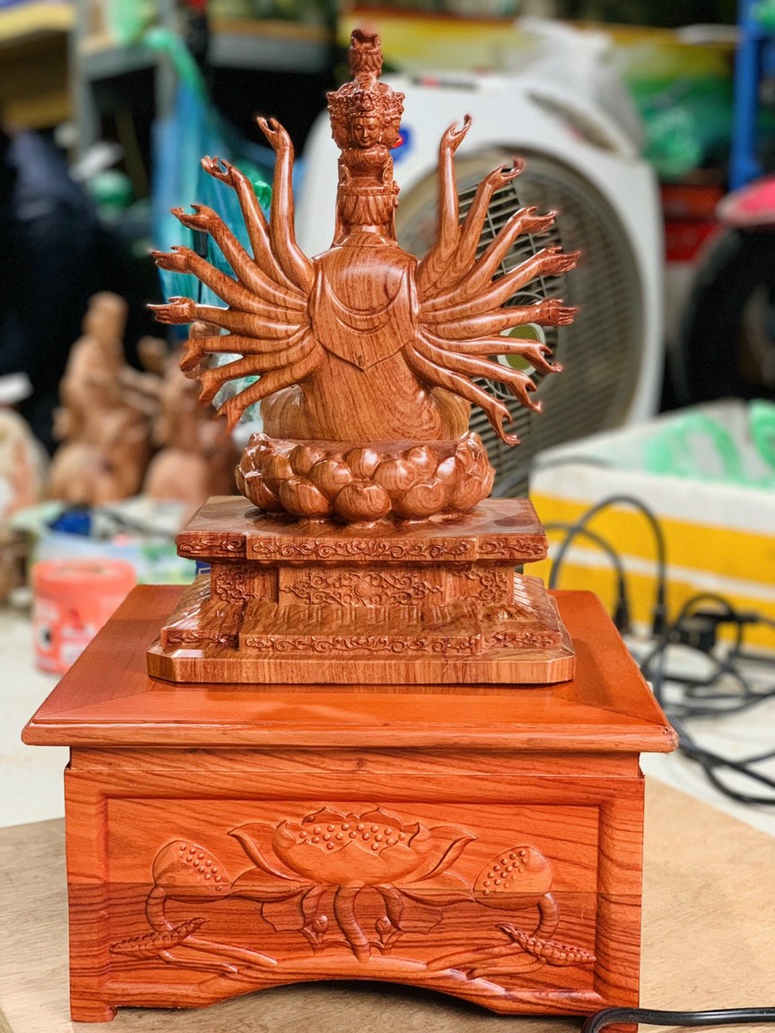 Tượng phật thiên thủ thiên nhãn được làm bằng chất liệu gỗ hương đá tự nhiên. 100% Kích thước cao 35×20×15cm  _ Tượng phật thiên thủy thiên nhãn được trạm khắc tỉ mỉ tinh sảo kỳ công .Đi hầu hết mọi chi tiết góc ngách hoa văn nội củ tượng phật đều được ngọt tỉa chỉnh sửa hoàn toàn bằng tay thủ công .Đồng thời tượng phật được kiểm định rất kỹ lưỡng như cho vào thẩm sấy cho gỗ khô kiệt .Mục đích trống dập nứt vênh mo mối mọt .Kết hợp với đánh giấy giáp kỹ cho sạch sẽ sờ mát lạnh song cho vào phun lót làm bóng mờ .Để giữ lại mầu sắc vân gỗ tự nhiên .Tượng phật thiên thủ thiên nhãn được làm và hoàn thiện do bàn tay khối óc tài hoa .Từ những người thợ dầy rặn  kinh nghiệm .Cũng như tay nghề cao trong làng nghề truyền thống .Chính vì thế tượng phật đã đáp ứng đầy đủ những tiêu trí ( Đẹp bền rẻ ) Thẩm mỹ nghệ thuật với chất lượng tuyệt vời