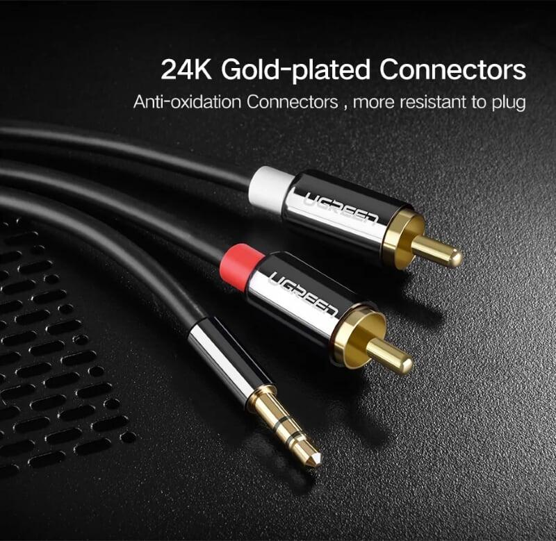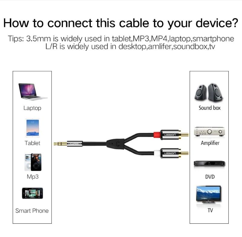 - Cáp Chuyển Đổi Ugreen 3.5mm Sang 2 RCA 10511 (1.5m) được dùng để kết nối từ điện thoại, máy tính, máy nghe nhạc… đến các thiết bị âm thanh có chuẩn RCA (hoa sen)