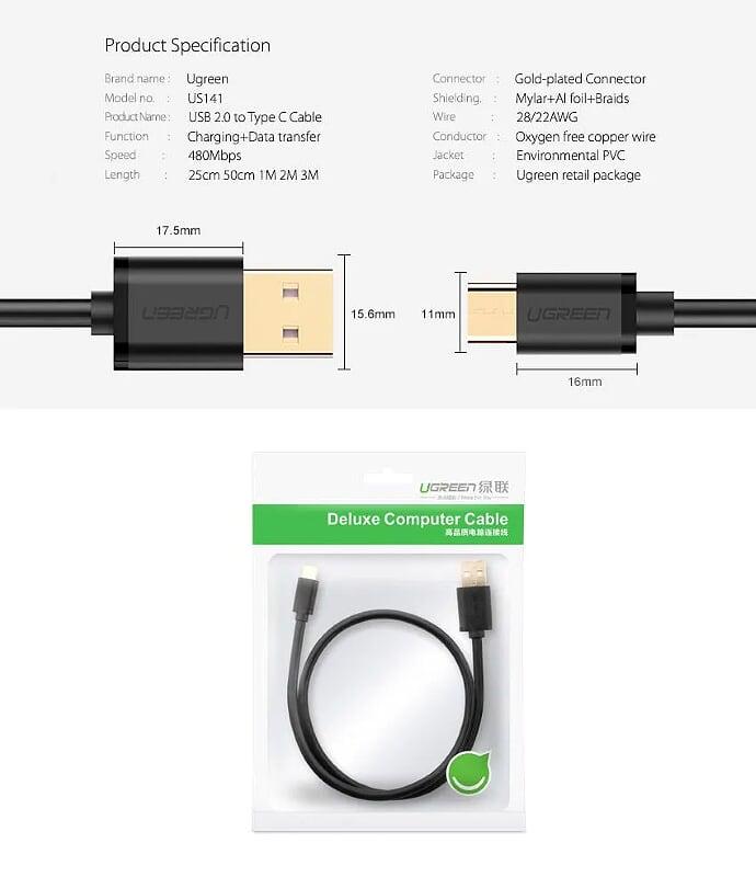 Ugreen 60128 2M Usb To Usb Type C Data Cable Aluninum Case Us288 1. Features: Charging cable, data transmission. 2. Cable length: 2M 3. Color: Gray 2. Input: USB 2.0 3. Output: USB-C 4. Compatible