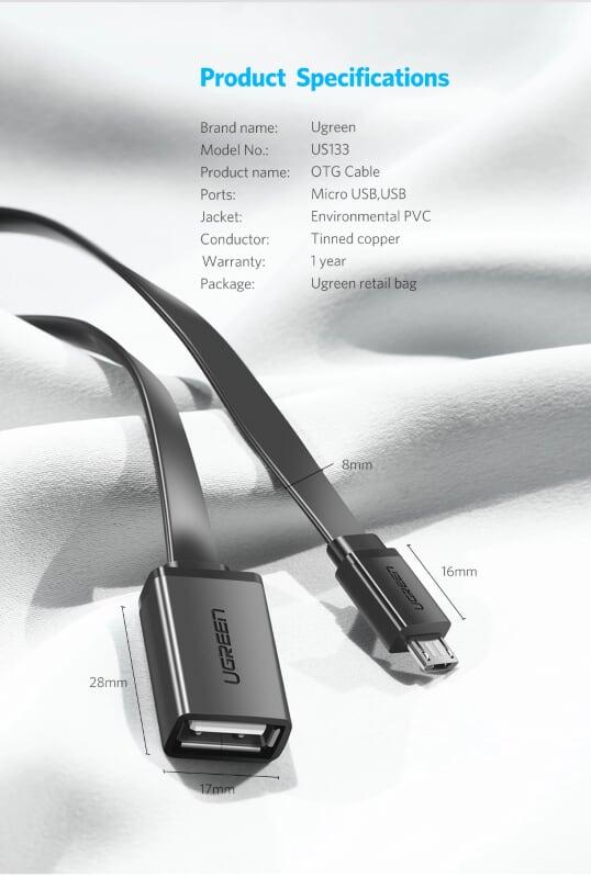 Ugreen 10822 12cm micro usb otg cable trắng us133 1. Length : 12CM 2. Color : White 3. USB Version : 2.0 4. Data Transfer Link Cable USB 2.0 OTG 5. 100 g 6. 15