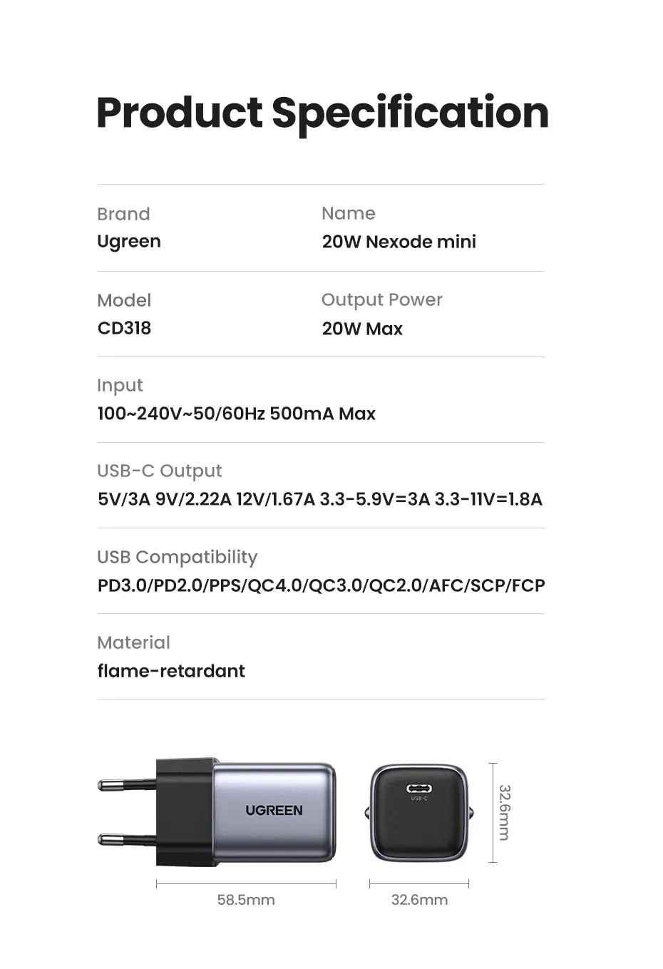 1. Input: 100-240V~50/60Hz 800mA Max 2. USB-C Output: 5.0V 3.0A/9.0V 3.0A/12.0V 2.5A/15.0 2.0A/20.0V 15A/3.3-11.0V 2.7A 3. Total Output Power: 30.0W Max