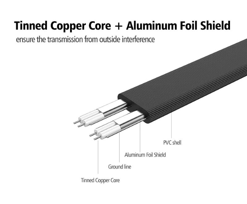1. Corrosion-resistant tinned copper conductors provide effective conductivity; Aluminum foil and ground wire double shielding minimize data loss. 2. Molded strain relief and TPE jacket make the cable bend flexibly providing reliable performance in durable