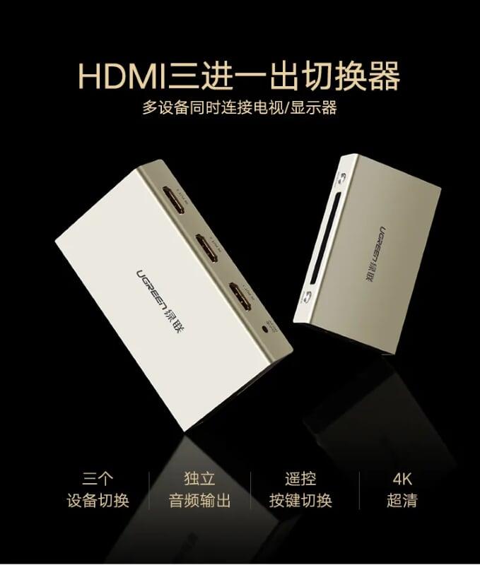 Ugreen 40369 Hdmi 3*1 Switch With 3.5Mm + Spdif Zinc Alloy Mm128 1. Features: Sharing a screen, a projector for 3 devices. 2. Input: HDMI x3 3. Output: HDMI x1, Optical Toslink x1, Audio 3.5mm
