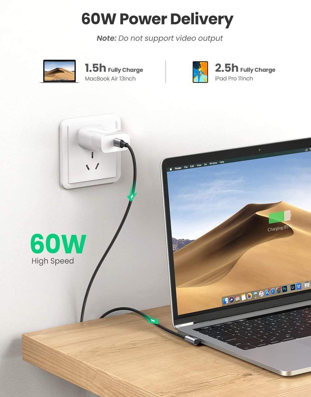 Mua tại Tiktok- The USB C to USB C Power Cable delivers max 60W(20V/3A) fast charging to Type C/Thunderbolt 3 laptops/tablets/phones, when paired with 96W/87W/65W/45W/18W USB Power Delivery charger. Fully recharge MacBook Air 13" in 1.5h, as fast as the original cable.