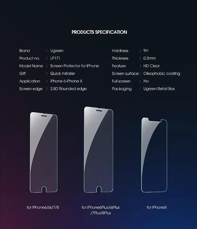 Ugreen 50953 3D Full Coverage HD Screen Protector SP111 1. 3D Full cover HD 2. For iPhone X + Xs 5.8 Inch 3. Hardness : 9H 4. Thickness : 0.3mm 5. Soft Edges : 3D