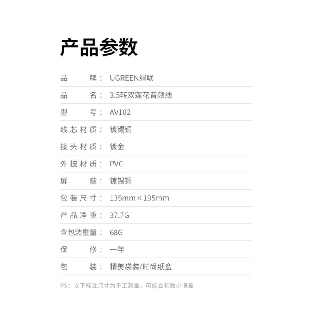 1. Connector A: 1 x 3.5mm Jack Male 2. Connector B: 2 x RCA Female, White (Audio left) Red (Audio right) 3. Cable Material: Nylon Braided 4. UGREEN 3.5mm(1/8" headphone plug) to 2 RCA(Right/Left) stereo