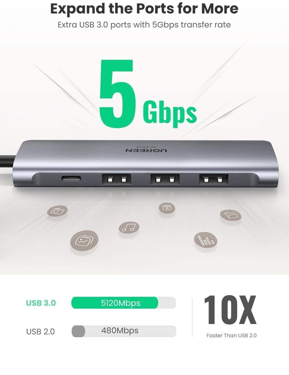 1. Hub USB C mở rộng khối lượng lớn: UGREEN USB C Hub cung cấp giải pháp đơn giản để nâng cấp PC của bạn, mở rộng Cổng 3xUSB 3.0, Gigabit Ethernet và cổng sạc