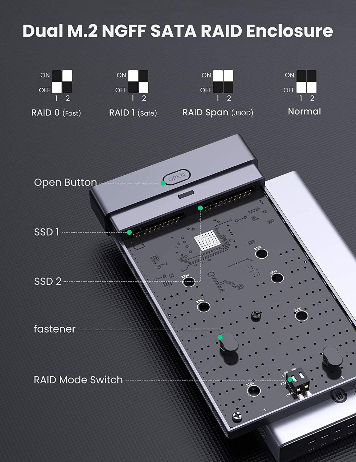 1. Material: Aluminum 2. Color: Silver 3. Drive Interface: Serial ATA 4. Drive Type: M.2 5. Number of Drives Supported: 2 6. RAID Supported: RAID 0, RAID 1 7. Data Transfer Rate: Up to 10Gbps