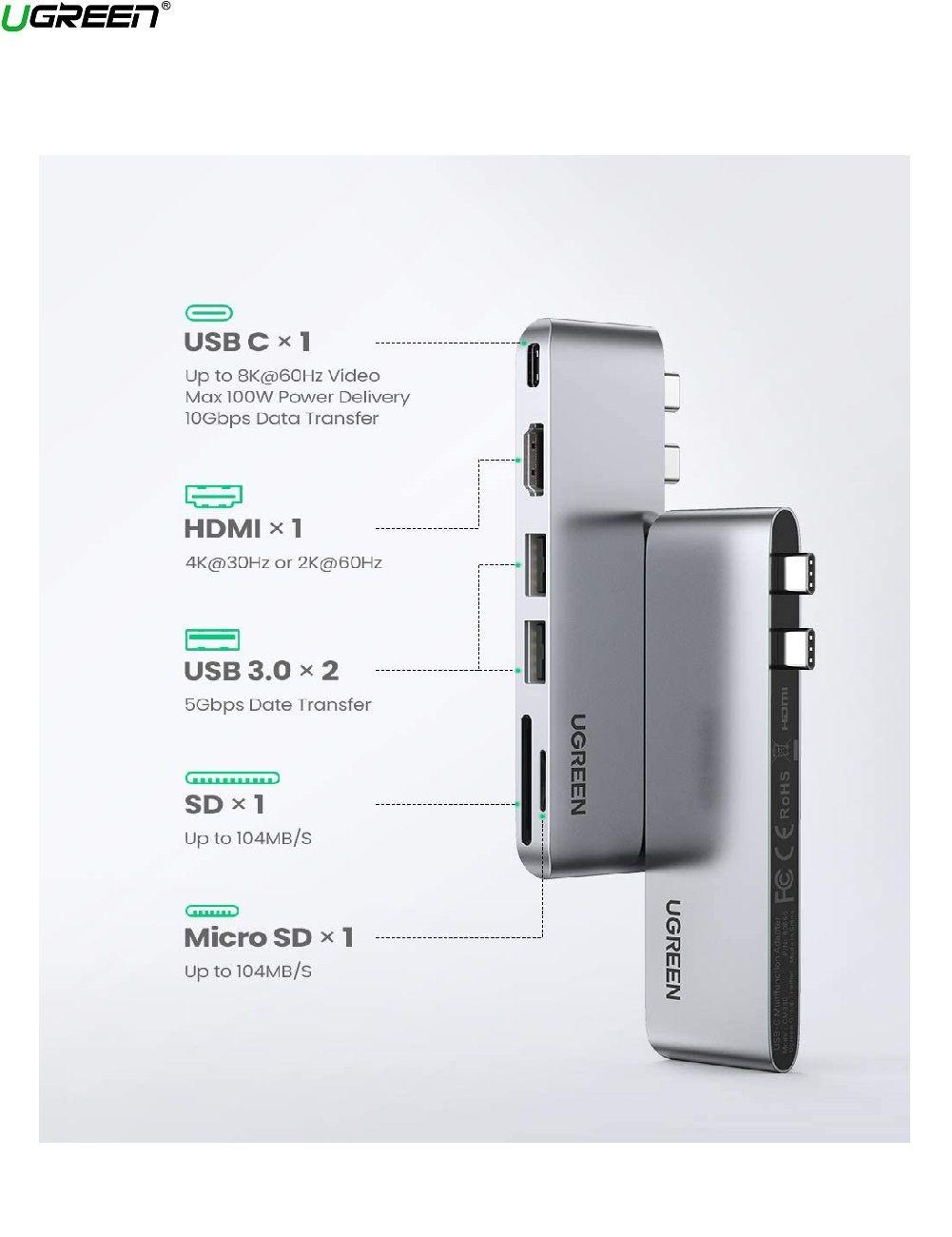 Ugreen UG90119CM490TK 4K 60Hz 60w PD Type C sang 2×USB 3.0 + 1×USB 2.0 + 2×HDMI + gigabits LAN RJ45 1000M + SD + TF Bộ chuyển đổi - HÀNG CHÍNH HÃNG  Đầu chuyển đổi Micro USB sang USB Type C - Hàng chính hãng