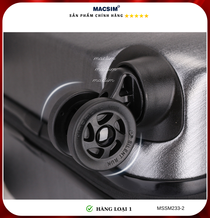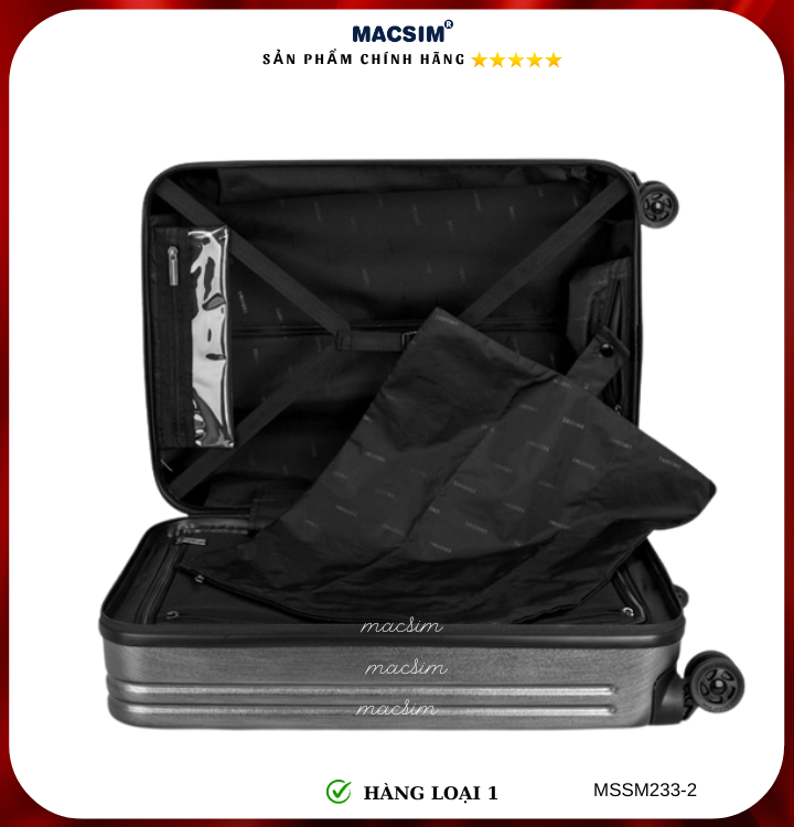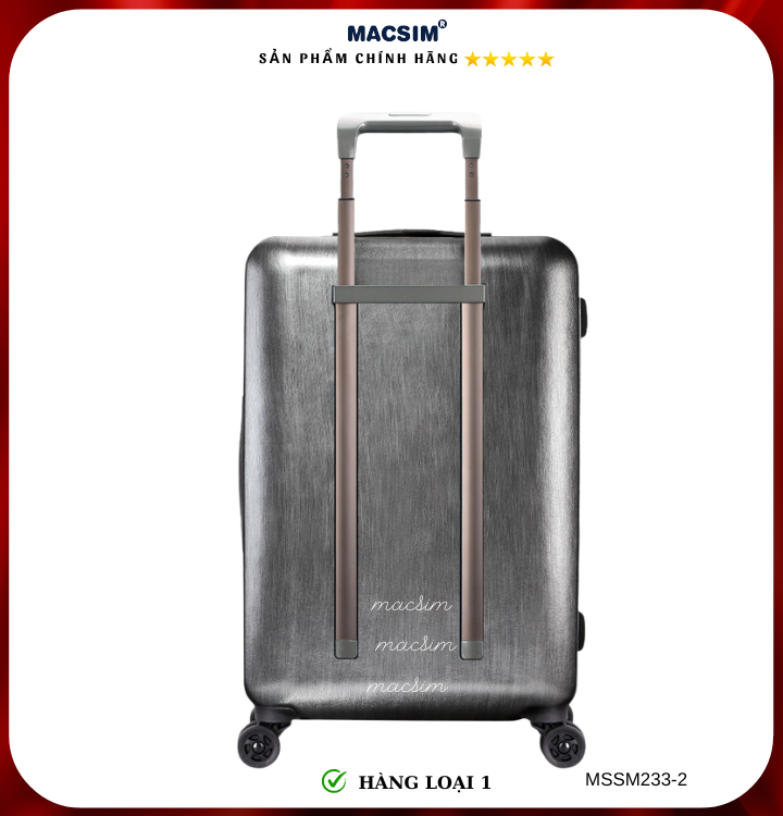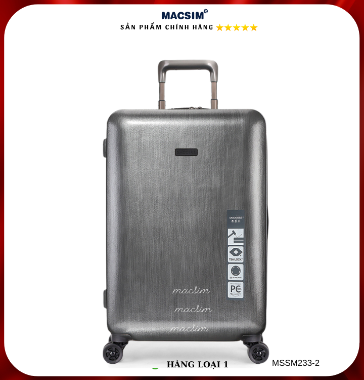 Vali Macsim được làm từ chất liệu nhựa nguyên chất PC. Tấm lót bên trong Poliester 150D xuất xứ Trung Quốc được REACH kiểm nghiệm và phê duyệt, bánh xe 360 độ hãng Hinomoto của Nhật ; Khóa kéo thương hiệu SBS xuất xứ Trung Quốc, Khóa TSA hãng Master Lock của Mỹ. Thiết kế vali đơn giản lịch lãm vô cùng sang trọng, bền bỉ, tạo dấu ấn phong cách thời trang cá nhân của bạn trên mọi cuộc hành trình. Vali cao cấp Macssim thích hợp với những người thường xuyên di chuyển cần chiếc vali nhẹ, có độ bền tốt.