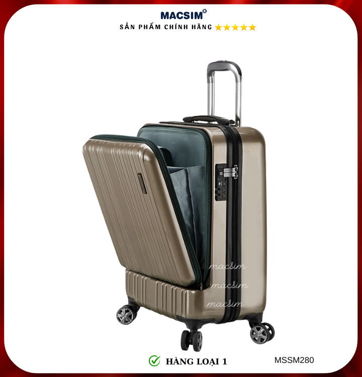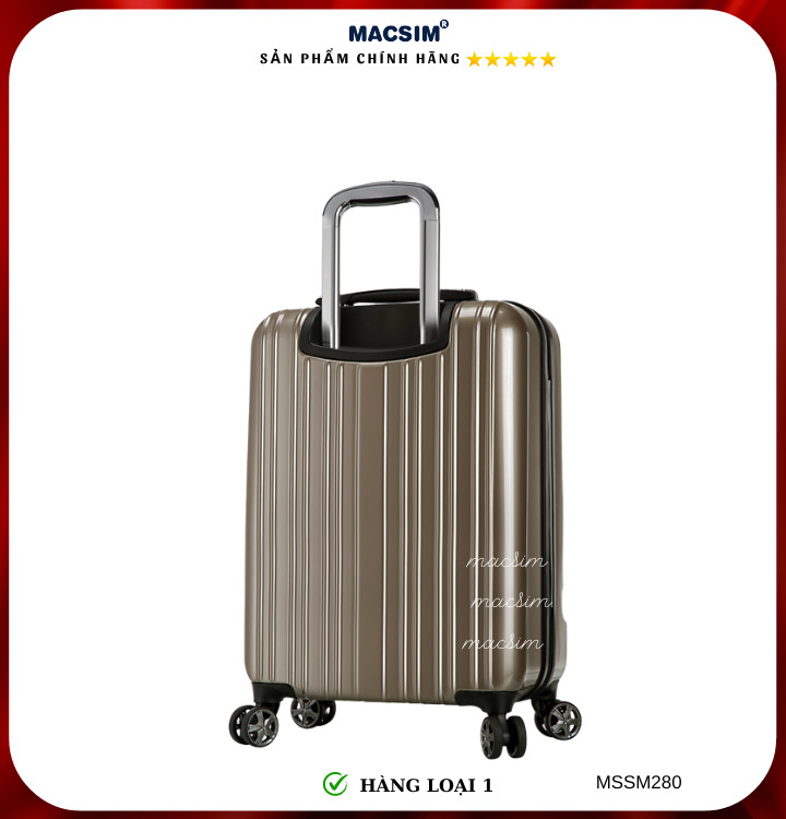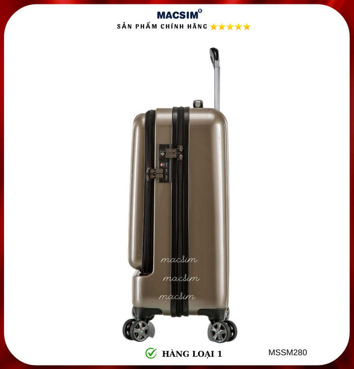 Vali Macsim được làm từ chất liệu nhựa nguyên chất PC. Tấm lót bên trong Poliester 150D xuất xứ Trung Quốc được REACH kiểm nghiệm và phê duyệt, bánh xe 360 độ hãng Hinomoto của Nhật ; Khóa kéo thương hiệu SBS xuất xứ Trung Quốc, Khóa TSA hãng Master Lock của Mỹ. Thiết kế vali đơn giản lịch lãm vô cùng sang trọng, bền bỉ, tạo dấu ấn phong cách thời trang cá nhân của bạn trên mọi cuộc hành trình. Vali cao cấp Macssim thích hợp với những người thường xuyên di chuyển cần chiếc vali nhẹ, có độ bền tốt.