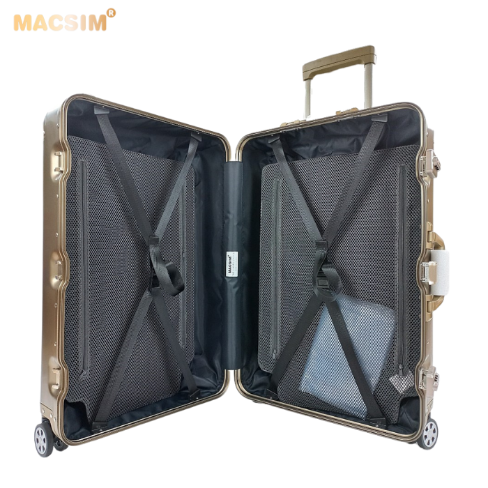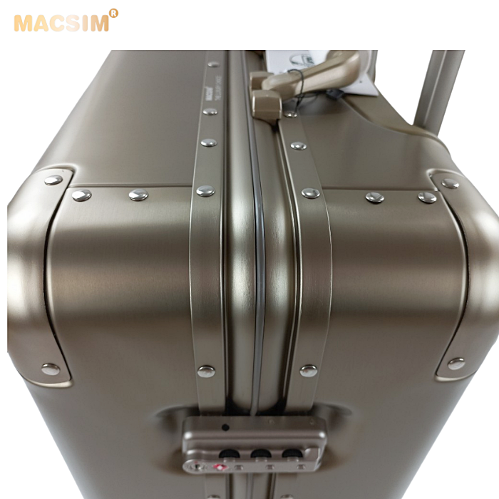 Toàn bộ thân vỏ vali Macsim làm bằng hợp kim nhôm A6063 làm cho vali rất nhẹ, độ đàn hồi cao, chống ăn mòn, chịu được tải trọng lớn.