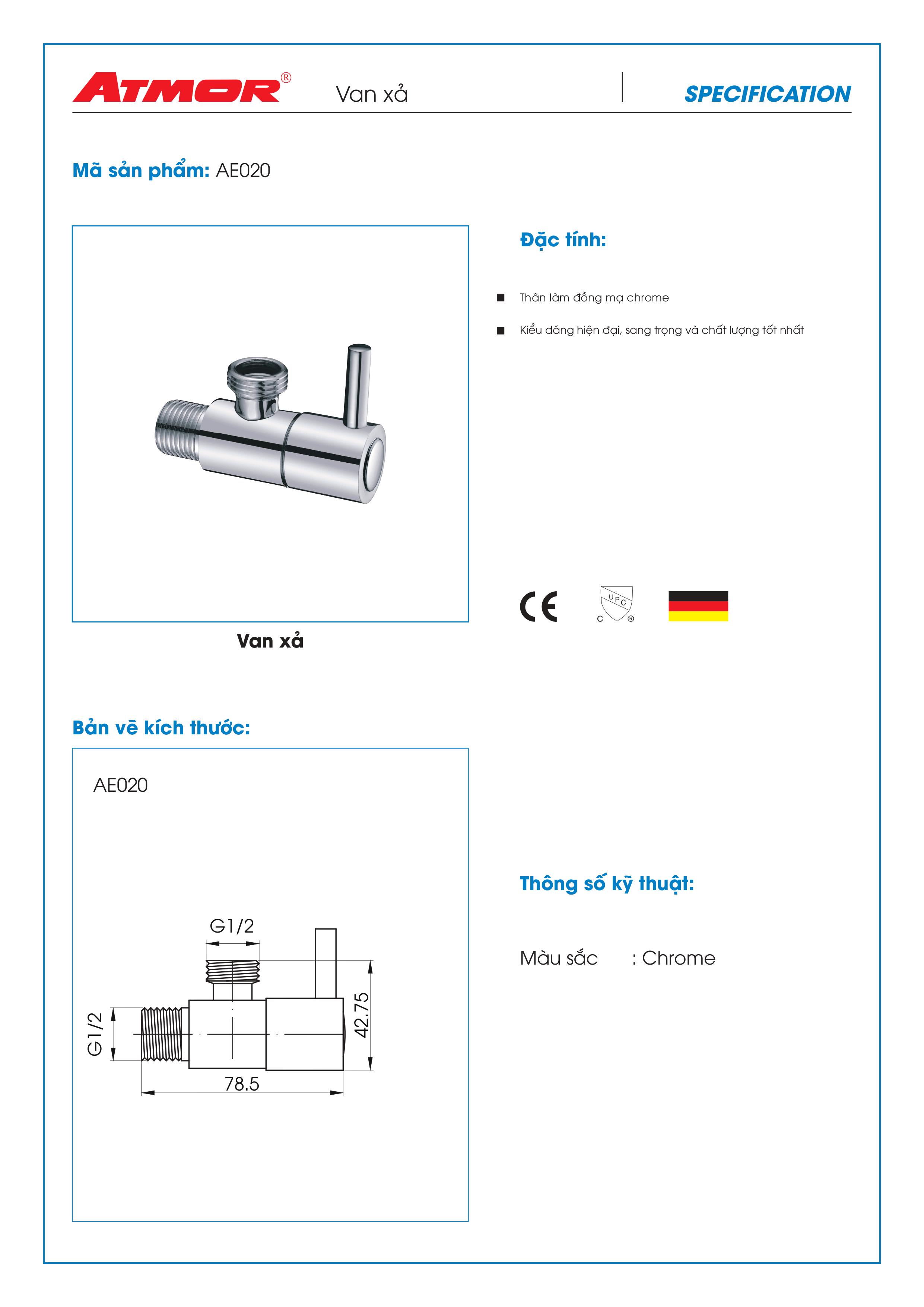 Mua tại TiktokVan xả ATMOR AE020 Thông tin sản phẩm Hãng sản xuất: ATMOR