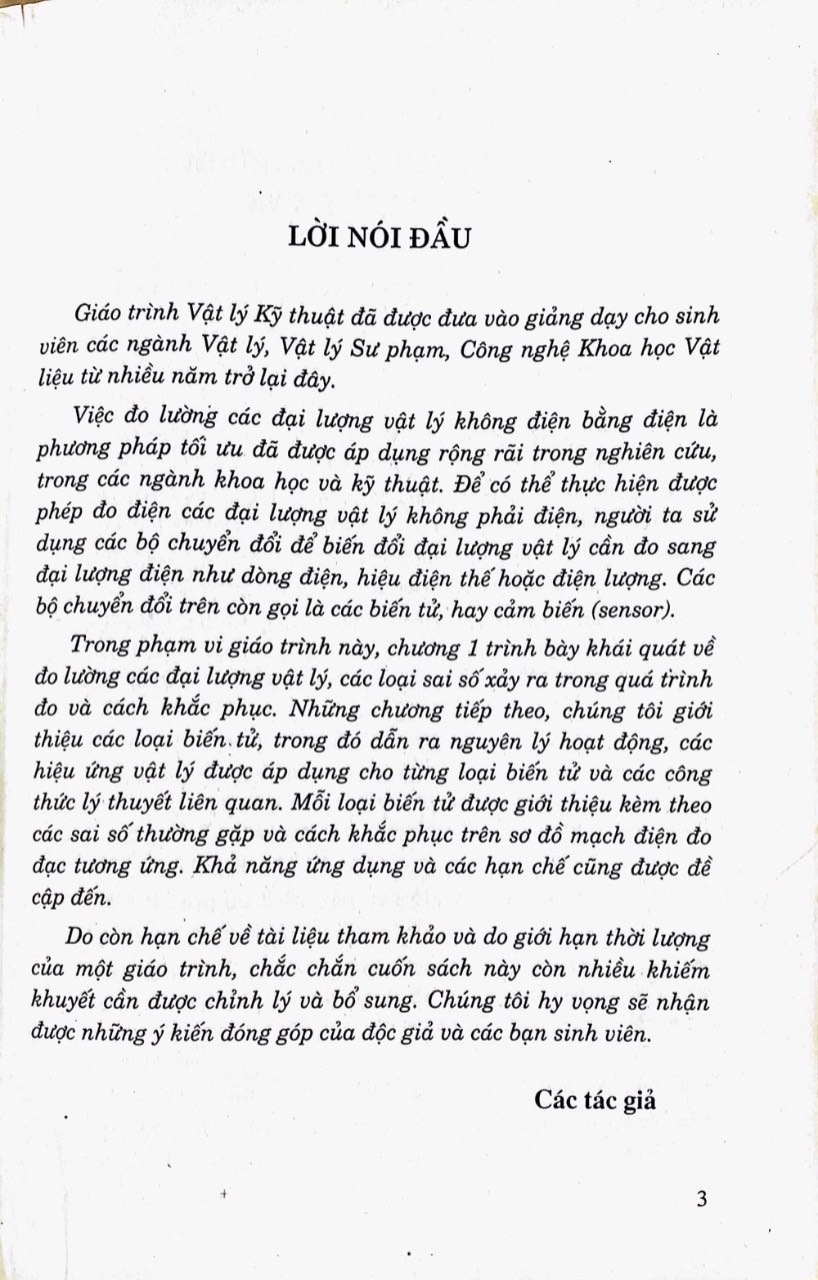Mua tại TiktokTrong phạm vi giáo trình này, chương I trình bày khái quát về đo lường các đại lượng vật lý, các loại sai số xảy ra trong quá trình đo và cách khắc phục. Những chương tiếp theo, chúng tôi giới thiệu các loại biến tử, trong đó dẫn ra nguyên lý hoạt động, các hiệu ứng vật lý được áp dụng cho từng loại biến tử và các công thức lý thuyết liên quan. Mỗi loại biến tử được giới thiệu kèm theo các sai số thường gặp và cách khắc phục trên sơ đồ mạch điện đo đạc tương ứng. Khả năng ứng dụng và các hạn chế cũng được đề cập đến.