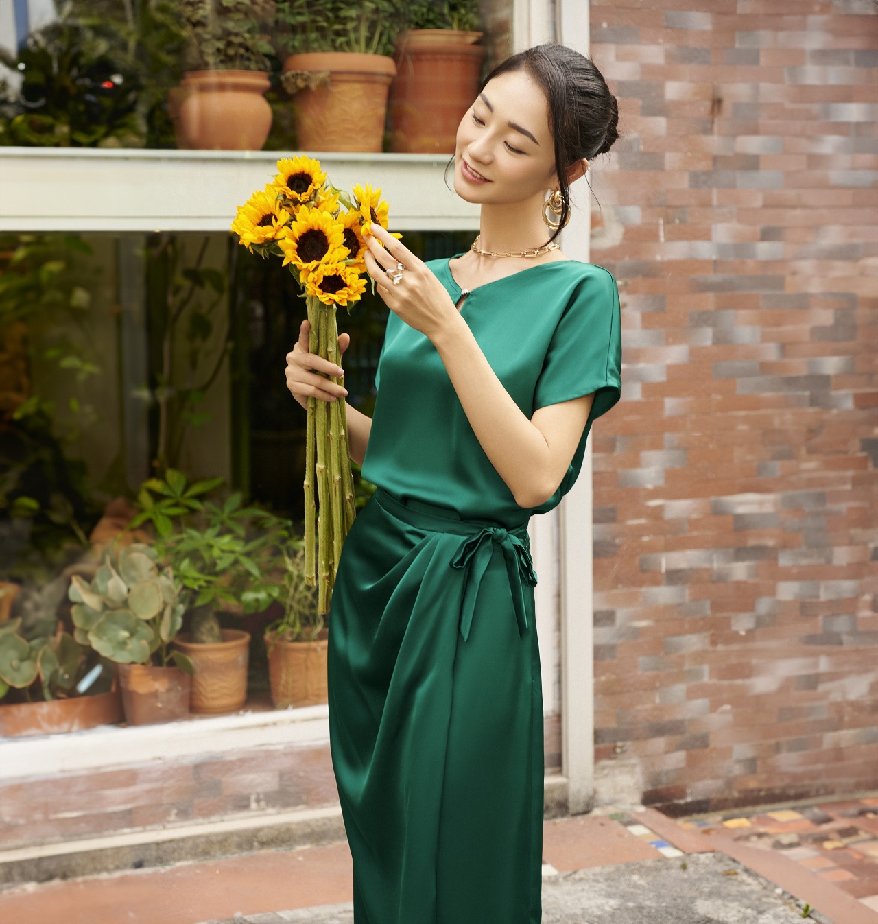 Điểm nhấn của chiếc váy chính là phần xẻ đùi trước táo bạo, giúp tôi khoe khéo đôi chân thon khỏe, dày công tập luyện. Phần thân váy được thiết kế dài trên mắc cá chân giúp tôi cảm thấy cơ thể cân bằng, chân dài, tạo nên sự thanh lịch và duyên dáng. Gam màu xanh ngọc lục bảo mang lại vẻ giàu sang cho người mặc, vì nó gợi nhớ màu sắc của một trong "tứ đại đá quý", viên đá emerald. Từ xa xưa, trong thiên nhiên có rất ít viên đá quý có gam màu xanh rực rỡ như thế này. Chẳng vì vậy mà ngọc lục bảo được trân quý từ hàng nghìn năm đến bây giờ. Thời Phục Hưng tại Ý, màu xanh thắm trên tranh vẽ của các bậc thầy danh họa phải được nghiền ra từ khoáng chất malachite, cũng là một viên đá bán quý được sử dụng trong trang sức. So sánh với sắc nâu từ đất nung, tím từ hoa thiên thảo hay vàng từ chì, giá trị của màu vẽ xanh lá đắt đỏ hơn nhiều. Vì vậy chúng cũng không bị phung phí, được sử dụng khá dè xẻn. Vì lịch sử gắn liền với những viên đá quý, gam màu xanh emerald luôn mang lại cho tôi sự kiêu hãnh khoác lên mình vẻ đẹp lộng lẫy quý phái.
