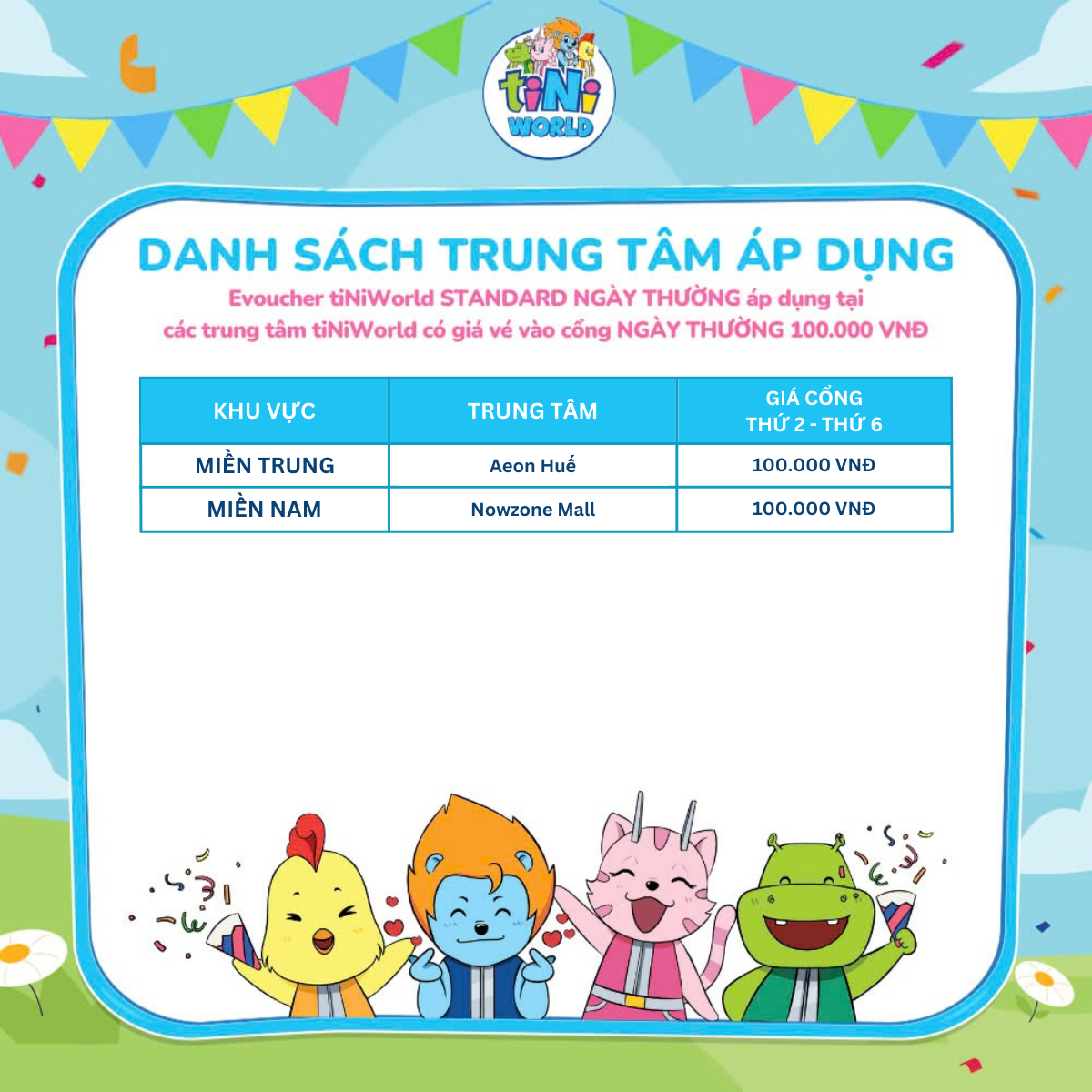 ✨Vé cổng điện tử tiNiWorld STANDARD NGÀY THƯỜNG áp dụng tại các trung tâm tiNiWorld có giá vé vào cổng 100.000 VNĐ