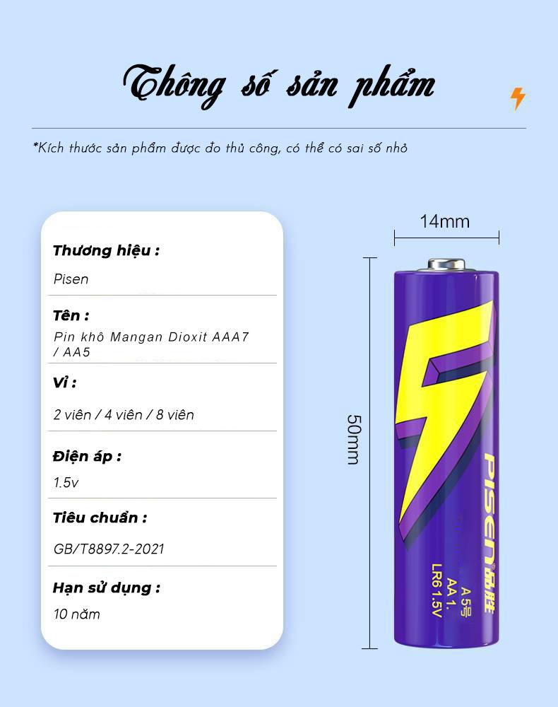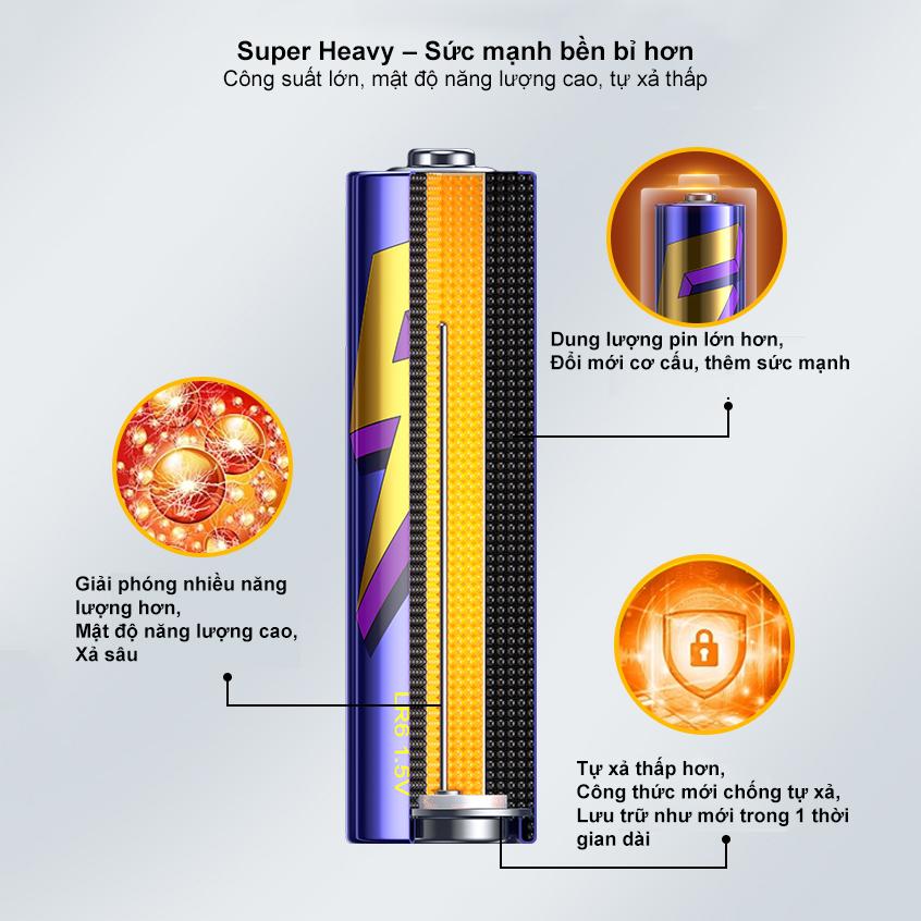 - Pin khô Purple Gold AA5 (Pin Tiểu) LR6 1.5V Super Heavy không chứa chì . Vật liệu bên trong có độ tinh khiết cao hơn, năng lượng điện mạnh hơn, thiết bị điện tiêu thụ nhiều năng lượng phù hợp hơn, hiệu quả hơn. Công nghệ "siêu lõi" tiên tiến, sức mạnh lâu dài hơn. Lữu trữ hơn 10 năm.