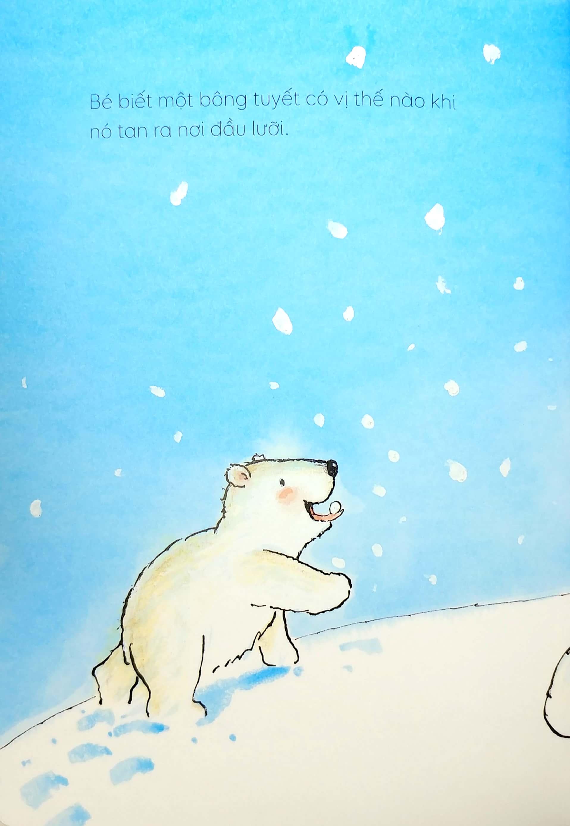 Bé Gấu Tuyết đã biết rất nhiều điều: đám cá ngon lành bơi ở đâu, bông tuyết có vị thế nào, gió có thể mơn man mà cũng có thể buốt táp, khi nào mặt trời nhô và khi nào mặt trăng ló. Bé cũng biết nếu ở cách mẹ bao xa thì dễ gặp nguy hiểm.