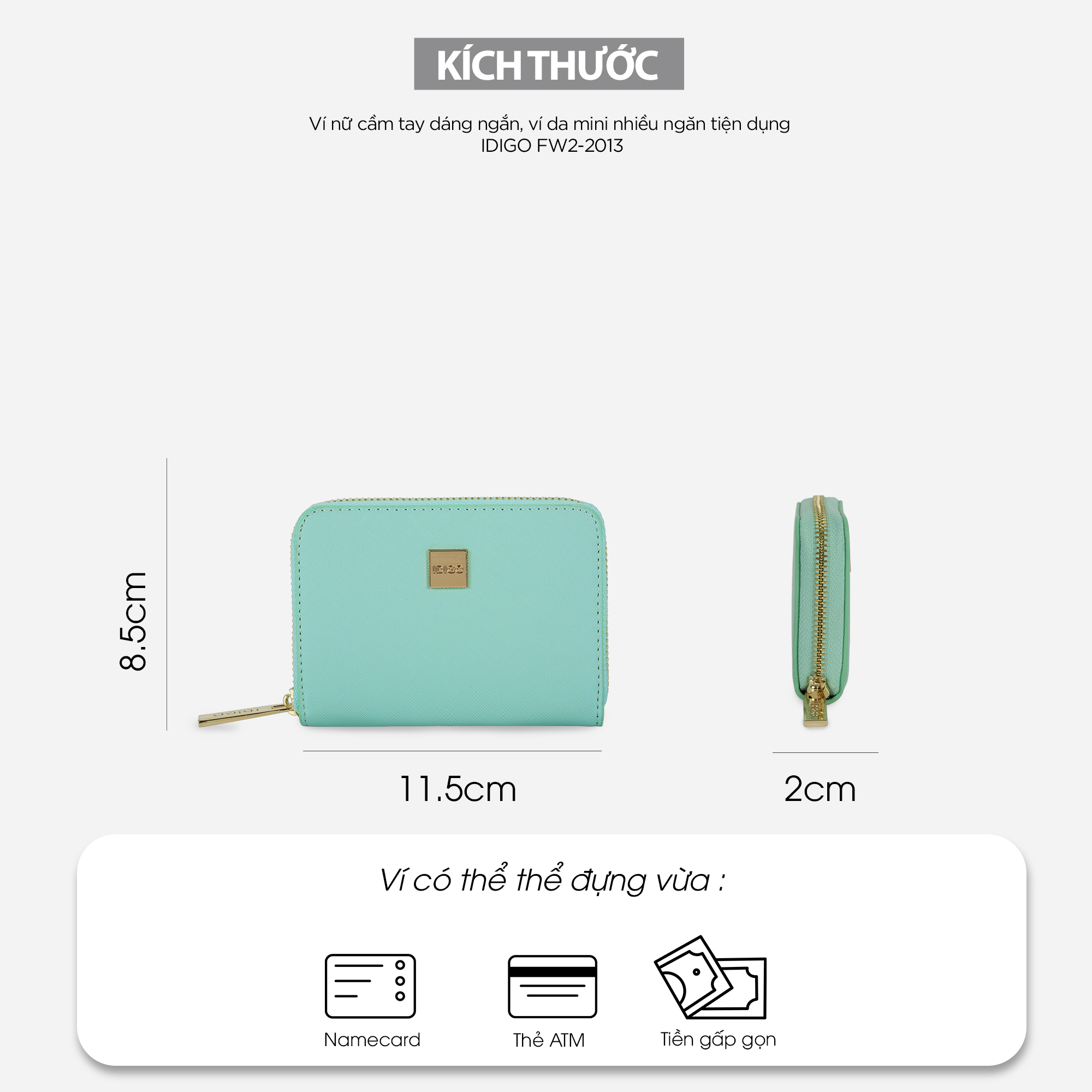 Mini Wallet - hay còn gọi là ví nhỏ cầm tay vốn là item chẳng mấy xa lạ với mọi người. Đây là kiểu ví nhỏ sử dụng hằng ngày, phổ biến nhất với chất liệu da chắc chắn, nhỏ gọn và tiện dụng cùng màu sắc thời trang. Đây cũng là người bạn đồng hành hằng ngày của các bạn trẻ yêu thích sự gọn gàng, tiện lợi với những chiếc ví đựng tiền và các loại thẻ.     Một chiếc ví nhỏ nhắn với đa dạng kiểu dáng và màu sắc lại rất hữu dụng ắt hẳn sẽ khiến cho các cô nàng yêu thời trang phải siêu lòng ngay từ ánh nhìn đầu tiên. Thấu hiểu được tâm tư của các nàng, IDIGO cho ra mắt sản phẩm Ví nữ cầm tay dáng ngắn, ví da mini nhiều ngăn tiện dụng IDIGO FW2-2013.     - Kích thước: 11.5 x 2 x 8.5cm (Dài x Rộng x Cao) - Màu sắc: Đen, Đỏ đô, Be, Hồng nude, Xanh ngọc - Chất liệu: Da tổng hợp  - Trọng lượng: 120 gram - Số ngăn: 3 ngăn chính, 2 ngăn phụ, 4 ngăn thẻ - Cách sử dụng: Cầm tay     Gam màu thời trang bắt mắt, bền màu với thời gian, đường may chắc chắn. Chất liệu da tổng hợp có độ mềm vừa đủ tạo nên phom dáng ví, vừa có độ đàn hồi cao vừa chống thấm nước nhẹ, bền đẹp và dễ dàng vệ sinh.    Phom ví cứng cáp vừa phải, giúp ví không bị cong vênh, nhăn gãy trong quá trình sử dụng, rất tiện khi sử dụng hằng ngày.      Bên trong ví có 3 ngăn chính, 2 ngăn phụ và 4 ngăn thẻ nhỏ giúp sắp xếp gọn gàng các loại thẻ, tiền và giấy tờ cá nhân có kích cỡ 9 x 7cm (Dài x Cao) trở xuống.      Ví có khoá kéo kim loại cao cấp hoạt động mượt mà và trơn tru, dây kéo bền & chắc chắn. Có thể kết hợp được với nhiều loại trang phục khác nhau giúp bạn linh hoạt đa phong cách.   Sản phẩm ví này được IDIGO đặt sản xuất tại nhà máy Trung Quốc và nhập khẩu chính ngạch về Việt Nam, có thông tin sản phẩm nhập khẩu in rõ ràng trên tem nhãn.    BẢO HÀNH SẢN PHẨM: - Sản phẩm được bảo hành và thay thế phụ kiện miễn phí trong 12 tháng sử dụng: phụ kiện, móc khóa, đường may... - Lưu ý: Với các lỗi do tác động ngoại lực như trầy xước, rách đứt bề mặt da, dây kéo bị gãy răng kéo, sản phẩm biến dạng do nhiệt độ cao sẽ không được bảo hành.    HƯỚNG DẪN BẢO QUẢN: - Hạn chế đi mưa hoặc hạn chế để sản phẩm tiếp xúc với nước - Bảo quản nơi khô ráo, thoáng mát, không nên để trong môi trường ẩm mốc hoặc nhiệt độ cao - Không để bề mặt da cọ xát với các vật cứng, sắc nhọn có thể làm trầy xước, rách da - Có thể vệ sinh bằng khăn khô hoặc các dung dịch vệ sinh dành riêng cho túi da
