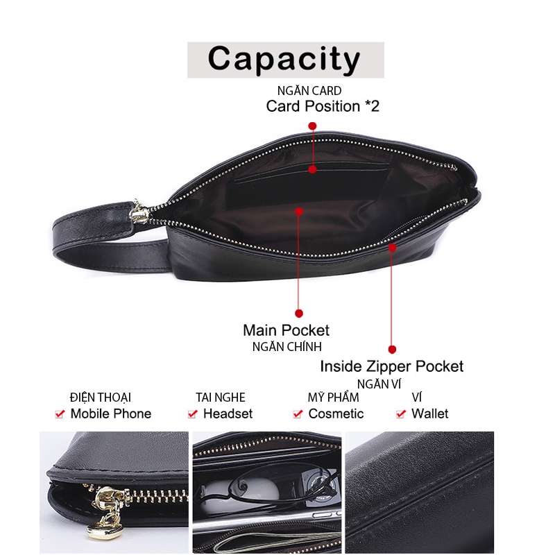 Chất liệu: Da cao cấp bền đẹp Kích thước 18.5x8.8 cm Sản phẩm có nhiều ngăn tiện lợi cho chị em để được nhiều đồ dùng như điện thoại,giấy tờ… · -Xuất xứ:VIỆT NAM -