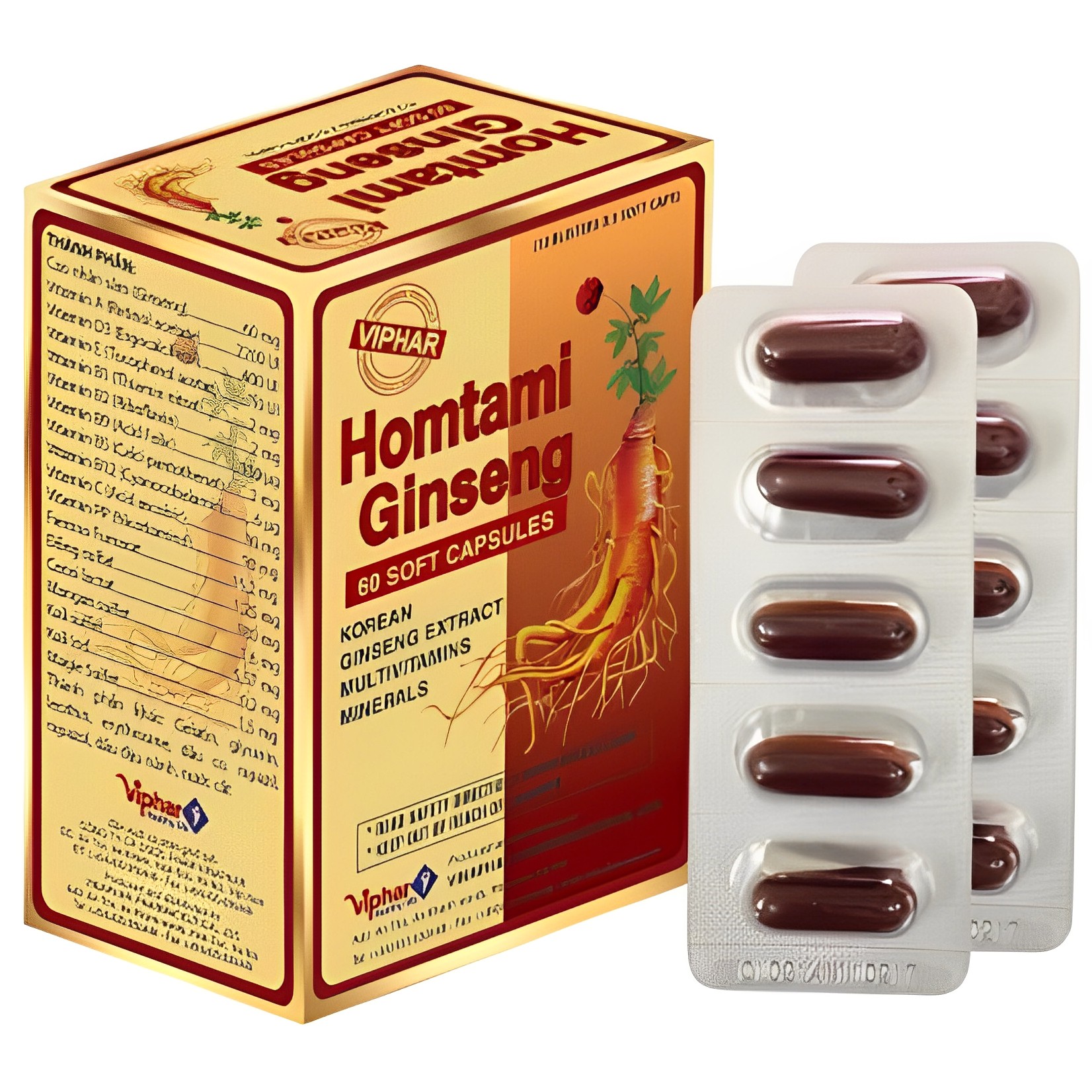 HOM USAR GINSENG PP.Pharco Hộp 60 viên Nang Mềm - Châu Ngân Pharma THÀNH PHẦN: Nhân sâm: ……………… 20mg Vitamin C: ………….… 10mg Vitamin pp: …………… 5mg Vitamin B1: ……………. 2mg Vitamin B6: ……………. 2mg