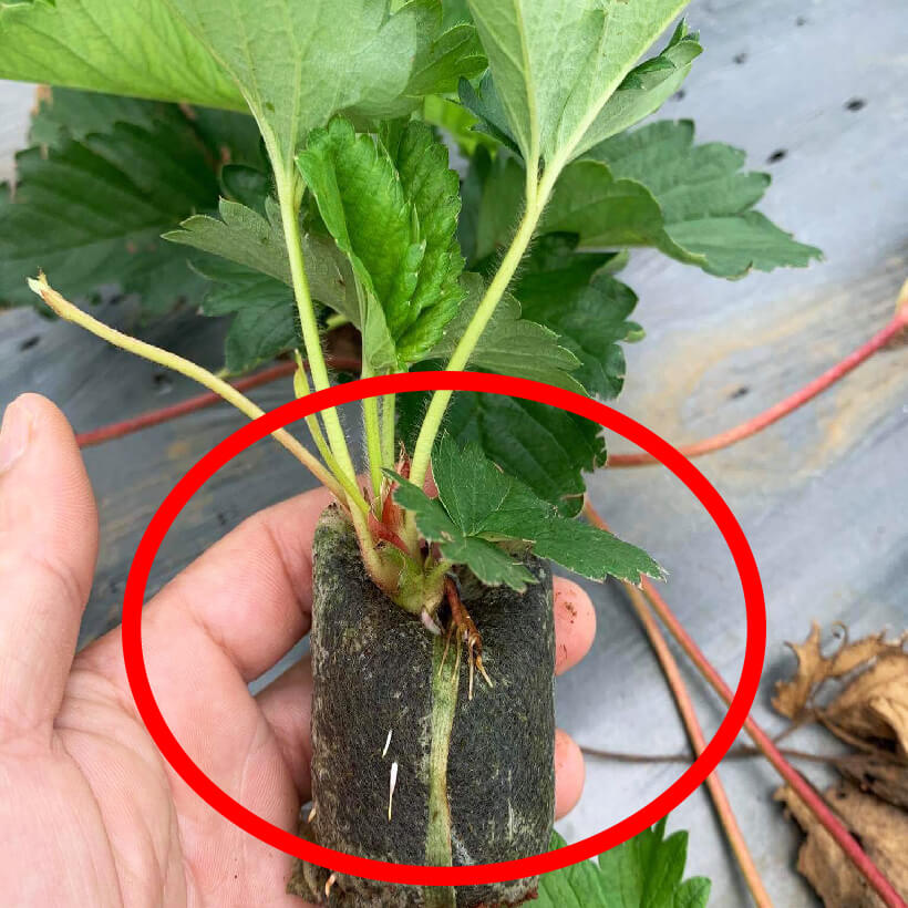 • Bước 2: Xé miệng viên trồng cây ra và tạo một lỗ vừa đủ rồi đưa ngó dâu vào, sau đó đặt ngó dâu lại rồi ghim tâm cố định vào.