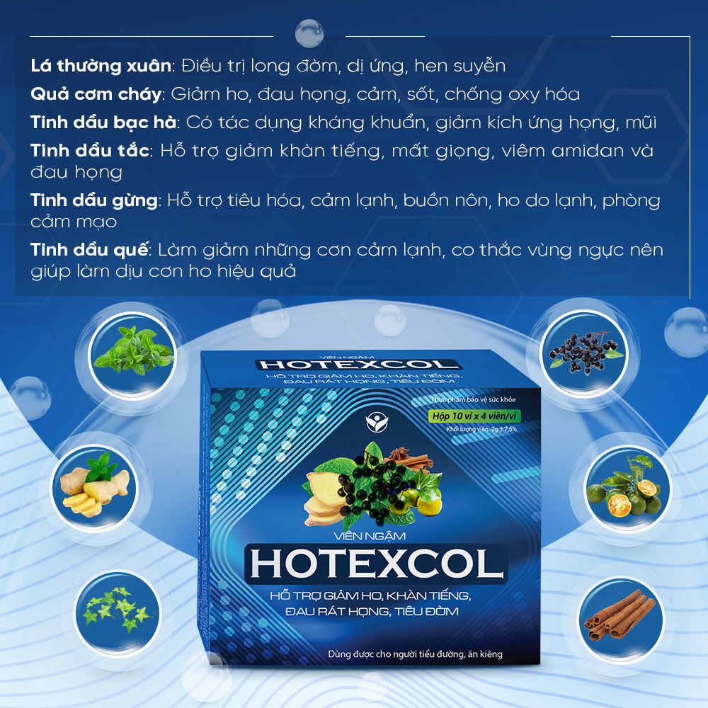 Viên ngậm Hotexcol là sự kết hợp của 2 thành phần đặc biệt, đi đầu thị trường trong lĩnh vực kẹo ngậm ho là Chiết xuất lá Thường xuân và Chiết xuất Quả Cơm cháy (Elderberry) cùng 5 loại tinh dầu: tinh dầu Bạc Hà, tinh dầu Tắc, tinh dầu Tần, tinh dầu Gừng, tinh dầu Quế giúp thông họng, giảm ho, giảm tiết đờm dãi, giảm đau rát họng do ho kéo dài.