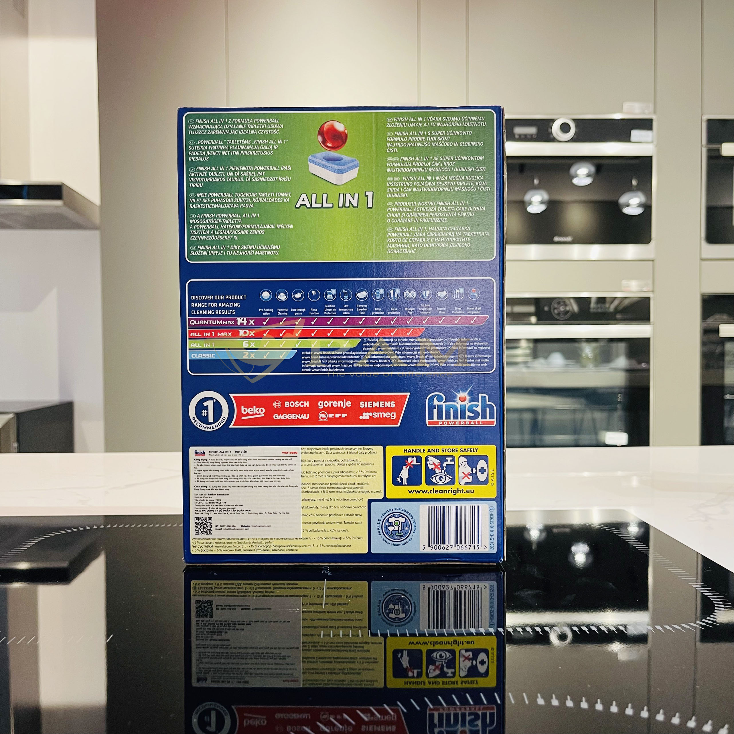 Viên rửa chén Finish Powerball Quantum cùng sức mạnh 12X vượt trội, bao gồm cả khả năng tẩy vết bẩn cứng đầu và bảo vệ chén dĩa thủy tinh và bạc. Finish giúp chén dĩa
