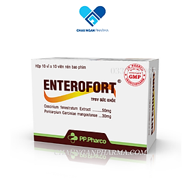 ENTEROFORT Rối loạn tiêu hóa PP.Pharma Hộp 100 viên bao phim THÀNH PHẦN: Cao vàng đắng 50mg Bột vỏ măng cụt 30mg CÔNG DỤNG: Nhiễm trùng đường ruột. Tiêu chảy. Lỵ trực trùng, hội chứng