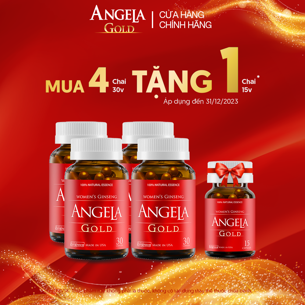 - KẾT QUẢ NGHIÊN CỨU KHOA HỌC Những nghiên cứu khoa học được thực hiện tại BV Phụ sản Trung Ương tại Việt Nam cho thấy tính hiệu quả và an toàn cao khi sử dụng Angela cho phụ nữ Việt Nam. Cải thiện các triệu chứng về da Cải thiện các triệu chứng rối loạn vận mạch, giấc ngủ và tiết niệu Cải thiện các triệu chứng về tình dục Cải thiện các triệu chứng về tâm thể và đau nhức Angela Gold – Bí quyết vàng khởi nguồn sức khỏe, sắc đẹp và sinh lý nữ. Ngay hôm nay, hãy cùng Angela Gold tìm lại làn da căng sáng, cuộc sống viên mãn, hạnh phúc và thành công! Bảo quản: Nơi khô ráo, thoáng mát, nhiệt độ dưới 30 độ C, tránh ẩm và ánh nắng mặt trời, để xa tầm tay trẻ em. Thông tin về công dụng sản phẩm công bố theo giấy phép SĐK: 10740/2020/ĐKSP.
