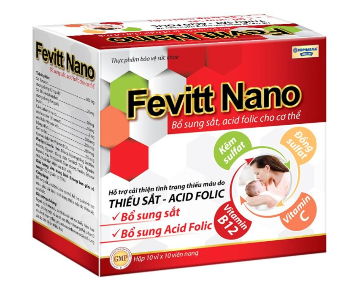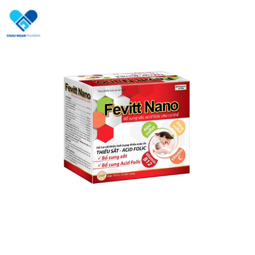 Fevitti nano phù hợp cho những người thiếu máu, kém ăn, người mất máu nhiều sau phẫu thuật. phụ nữ mang thai và cho con bú. Nếu bạn đang gặp tình trạng thiếu máu, da dẻ xanh xao, vàng vọt cũng có thể sử dụng sản phẩm này. MÔ TẢ SẢN PHẨM FEVITT NANO  Fevitt nano được bộ y tế cấp phép và sản xuất tại nhà máy đạt chuẩn MGP HD –PHARMA có trên 60 năm kinh nghiệm sản xuất dược phẩm, thực phẩm chức năng, vật tư y tế.   Fevitt nano chứa hàm lượng sắt sunfat cao giúp đáp ứng được nhu cầu bổ sung sắt của bà bầu, phụ nữ đang cho con bú hoặc người bị thiếu máu với các triệu chứng hoa mắt, chóng mặt, vàng da,… Lưu ý sản phẩm này không phải là thuốc, không có tác dụng thay thế thuốc chữa bệnh. Nên đọc kỹ hướng dẫn sử dụng trước khi dùng để mang lại hiệu quả tốt nhất. THÀNH PHẦN BỔ MÁU FEVITT NANO Fevitt nano bổ máu được kết hợp từ nhiều thành phần với hàm lượng cụ thể sau đây, bạn có thể xem để hiểu rõ hơn về sản phẩm. Sắt fumarat : ……………………………………………………………….100mg Calci carbonat nano:……………………………………………………… 10mg Sắt (III) pyrophosphate :………………………………………………….. 20mg Inulin : ………………………………………………………………………..20mg VitaminC :………………………………………………………………….. 5mg Acid folic : ……………………………………………………………………500mcg Đồng sulfat : ……………………………………………………………..…200mcg Kẽm sulfat : …………………………………………………………………200mcg Vitamin B12 : ……………………………………………………………….7,5 mcg Phụ liệu: dầu đậu nành, dầu dọ, sáp ong trắng, lecithin, gelatin, glycerin, dung dịch sorbitol 70%, nipagin, nipasol, màu ponceau 4R, … nước tinh khiết vừa đủ 1 viên CÁCH SỬ DỤNG FEVITT NANO Nên sử dụng fevitt nano cho người trên 6 tuổi hoặc theo chỉ định của bác sĩ. Mỗi lần uống 1 viên, ngày 1 lần, nên uống trước hoặc sau ăn sáng 30 phút. Tránh uống lúc quá đói hoặc quá no sẽ ảnh hưởng đến việc hấp thu các vi chất quan trọng có trong sắt . ĐỐI TƯỢNG PHÙ HỢP SỬ DỤNG FEVITT NANO – Người bị thiếu máu do thiếu sắt với các biểu hiện: hoa mắt, chóng mặt, da xanh xao – Phụ nữ mang thai, phụ nữ chuẩn bị mang thai cần bổ sung sắt để giúp bào thai phát triển khỏe mạnh – Phụ nữ sau sinh có nhu cầu bổ sung sắt do chế độ ăn thiếu hụt, bị thiếu máu CHỐNG CHỈ ĐỊNH FEVITT NANO Không dùng fevitt nano cho người mẫn cảm với bất kỳ thành phần nào của sản phẩm CÁCH BẢO QUẢN FEVITT NANO Bảo quản nơi khô ráo, tránh ánh nắng trực tiếp, để xa tầm tay trẻ em
