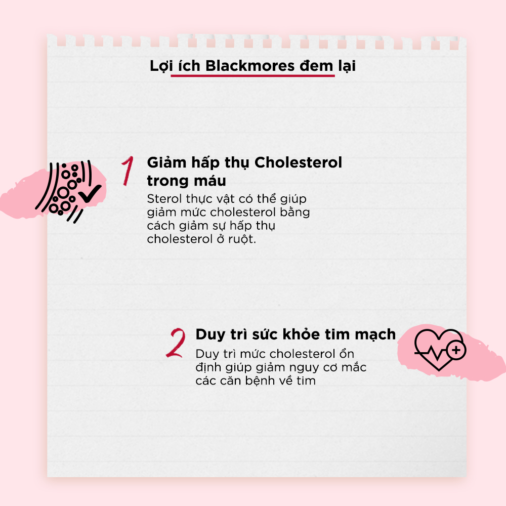 Viên uống Blackmores Cholesterol Health chính là sự lựa chọn hoàn hảo cho những ai muốn duy trì mức cholesterol khỏe mạnh. Viên uống giúp cung cấp thành phần sterols thực vật nhằm làm hỗ trợ giảm sự hấp thu cholesterol ở ruột từ các nguồn thực phẩm hằng ngày, nhờ đó duy trì lượng cholesterol khỏe mạnh, hỗ trợ giảm các nguy cơ về bệnh tim mạch ở người lớn.