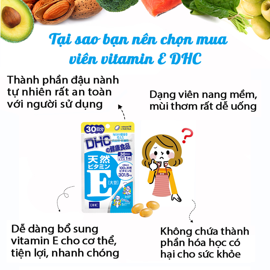 - Viên uống vitamin E DHC chống lão hóa tuyệt vời. Khi cơ thể bạn thiếu vitamin E, da sẽ nhanh chóng lão hóa, các vết nhăn xuất hiện sớm cùng với thâm, nám. Đồng thời tóc và móng sẽ không còn khỏe mạnh.