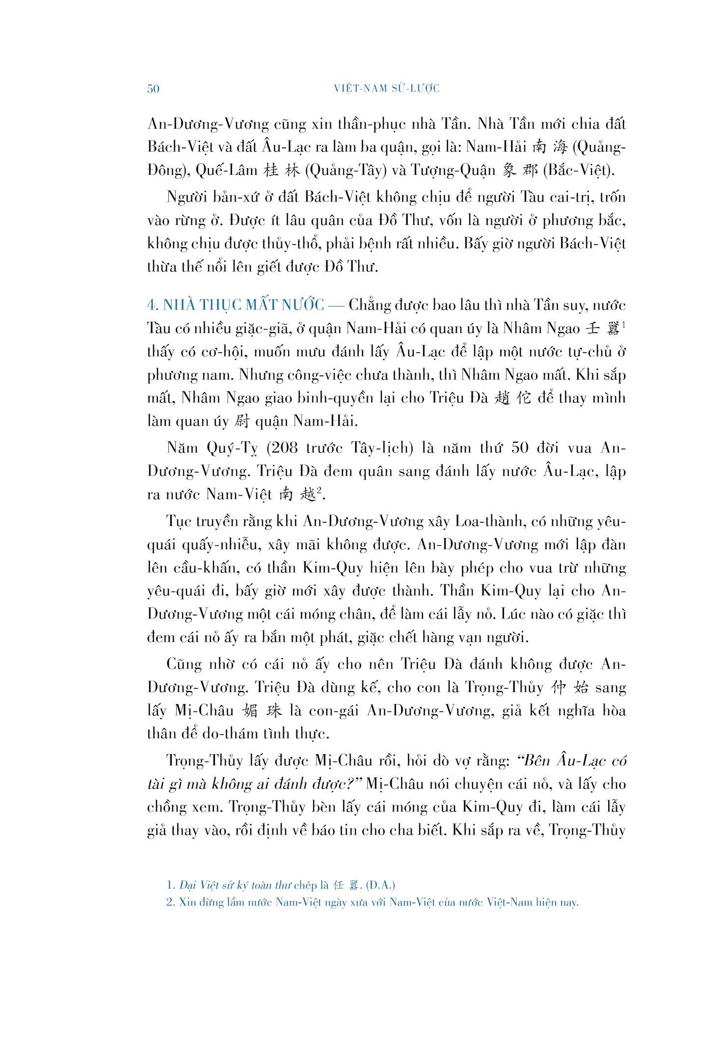 Để góp phần hoàn thiện và phổ biến “tấm Nam sử” mà học giả Trần Trọng Kim đã dệt những sợi đầu tiên cách nay đúng một thế kỷ, Đông A tiến hành tái bản tác phẩm Việt Nam sử lược, dựa theo bản in của nhà Tân Việt năm 1954, có bổ sung một số chi tiết từ các bản in năm 1920, 1928 và 1971. Đồng thời, chúng tôi tuyển lựa và thêm vào một số hình ảnh minh họa từ nguồn tranh dân gian, bảo tàng và một số tư liệu sách báo xưa, với mong muốn gửi tới bạn đọc một ấn bản không chỉ chỉn chu về mặt nội dung mà còn trang nhã về mặt hình thức, nhân kỷ niệm 100 năm ngày tác phẩm ra đời 1920 - 2020.
