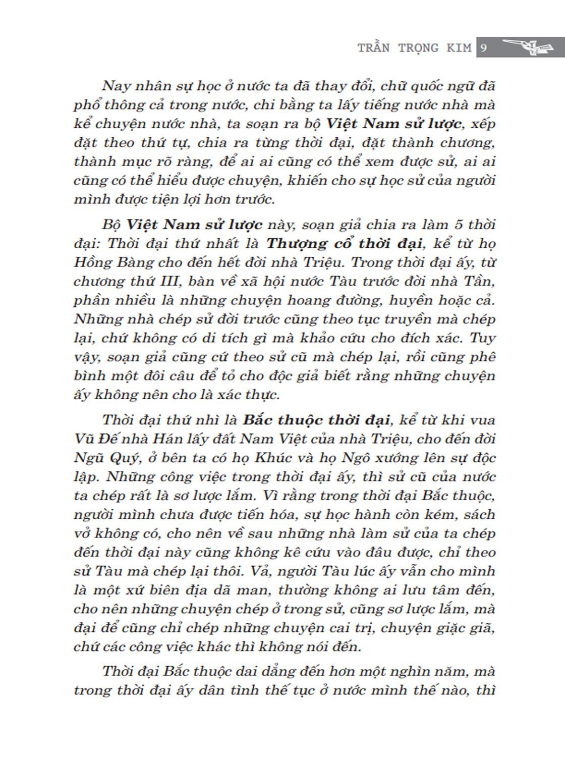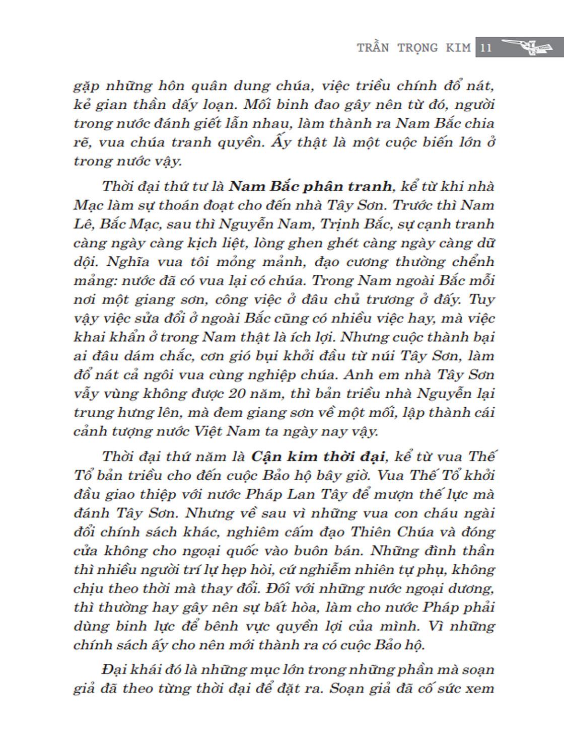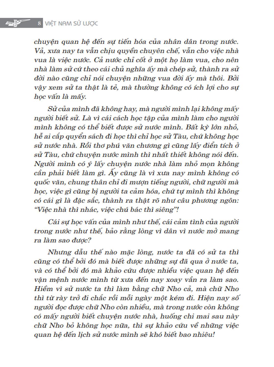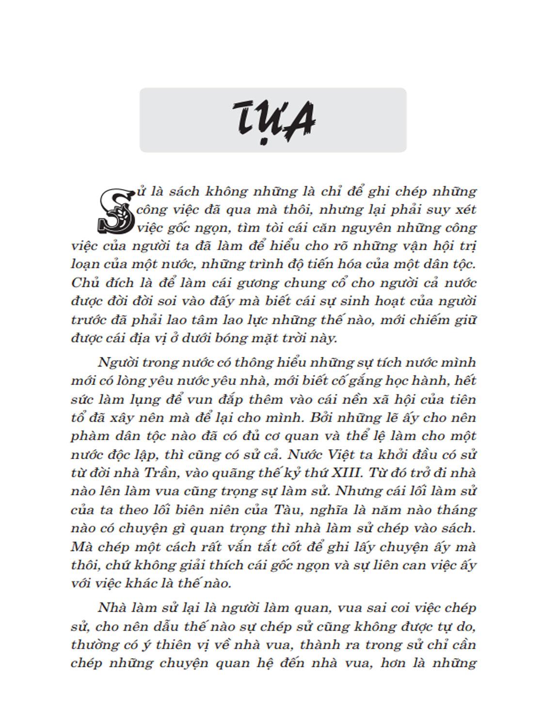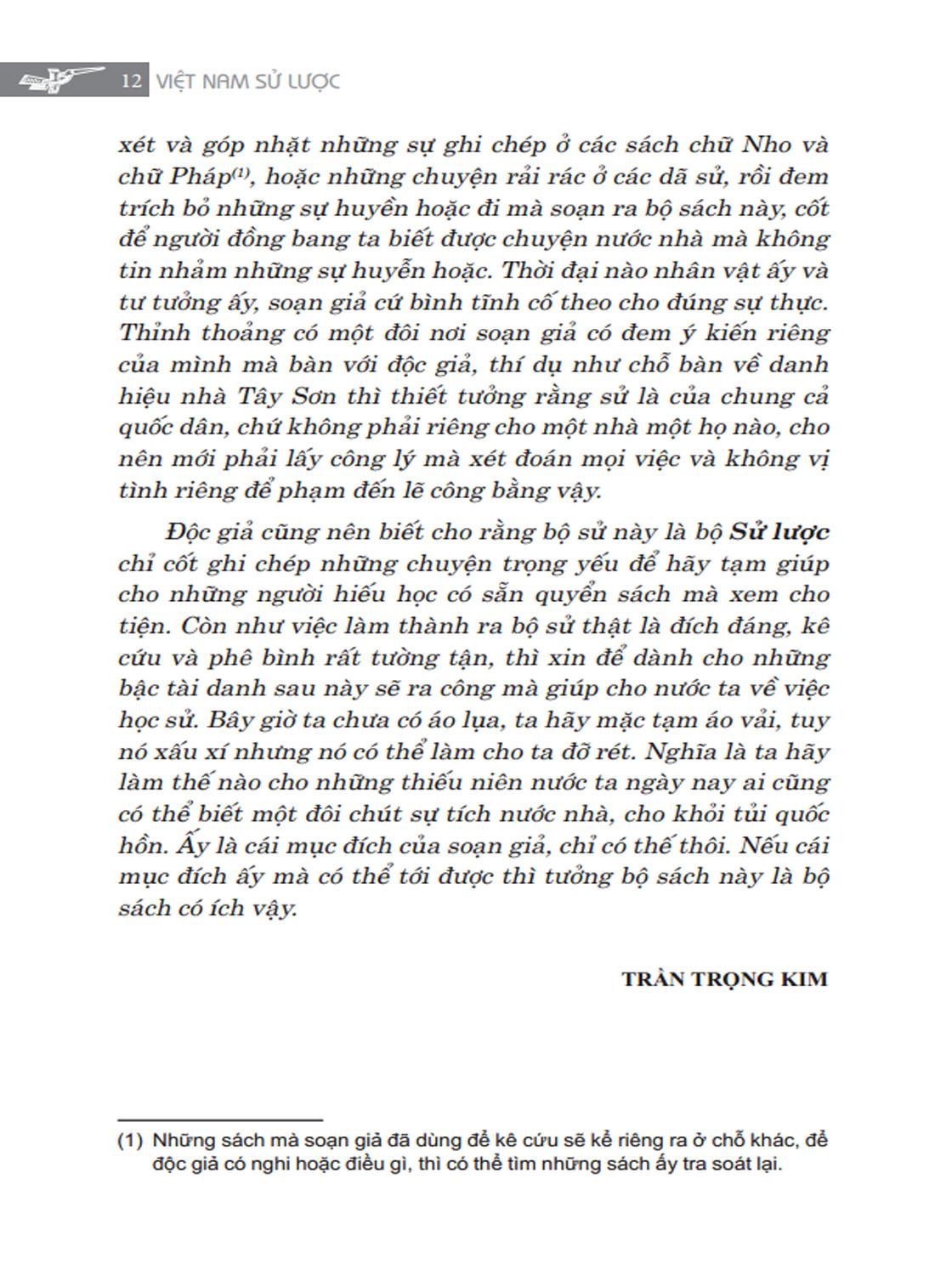 Độc giả cũng nên biết cho rằng bộ sử này là bộ Sử lược chỉ cốt ghi chép lại những chuyện trọng yếu để hãy tạm giúp cho những người hiếu học có sẵn quyển sách mà xem cho tiện. Còn như làm ra việc bộ sử thật sự thích đáng kê cứu và phê bình rất tường tận, thì hãy xin để dành cho những bậc tài danh sau này sẽ ra công mà giúp cho nước ta về việc học sử.