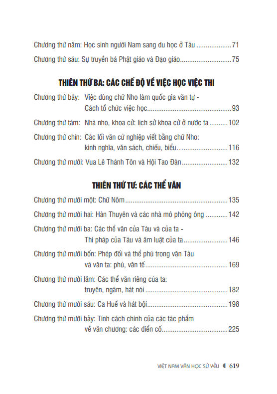 Tác giả đề cập đến nền văn học Việt một cách khá toàn diện: văn chương bình dân; các chế độ về việc học và việc thi; các thể văn; vấn đề ngôn ngữ văn tự, văn chương qua các thời kì (Lý, Trần, Lê, Mạc, Nam Bắc phân tranh, cận ); ảnh hưởng của nước Tàu; ảnh hưởng của nước Phá