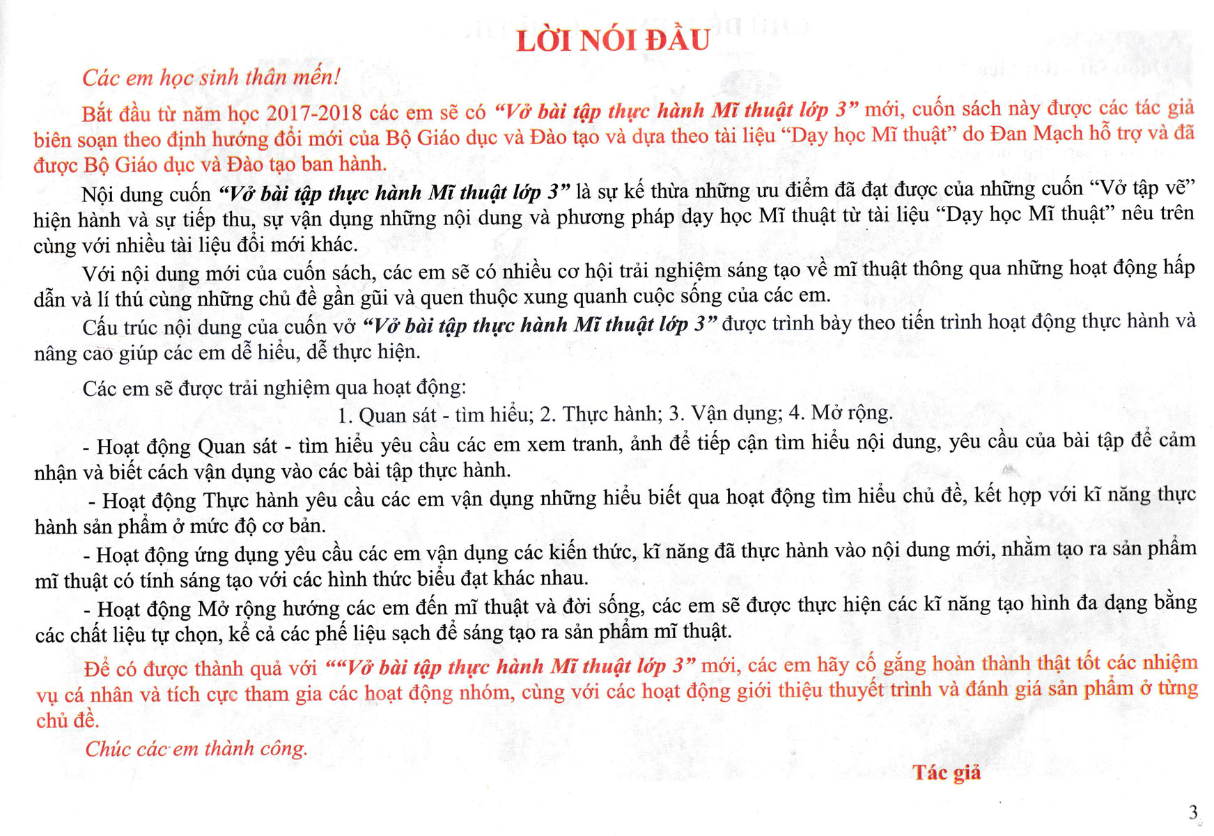 Bắt đầu từ năm học 2017-2018 các em sẽ có Vở Bài Tập Thực Hành Mĩ Thuật Lớp 3 (Biên Soạn Theo Chương Trình GDPT Mới) mới, cuốn sách này được các tác giả biên soạn theo định hướng đổi mới của Bộ Giáo dục và Đào tạo và dựa theo tài liệu “Dạy học Mĩ thuật” do Đan Mạch hỗ trợ và đã được Bộ Giáo dục và Đào tạo ban hành.