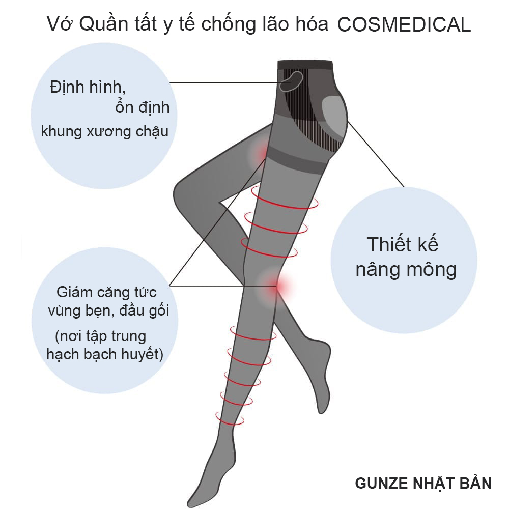 Mua tại TiktokSản phẩm vớ/ quần tất Cosmedical của GUNZE được nghiên cứu xem xét sự lão hóa của đôi chân với 3 phương pháp tiếp cận là: tư thế (hình dáng), tuần hoàn lưu thông máu và làn da của phụ nữ trung niên từ ngoài 40 tuổi khi bắt đầu có các dấu hiệu lão hóa.