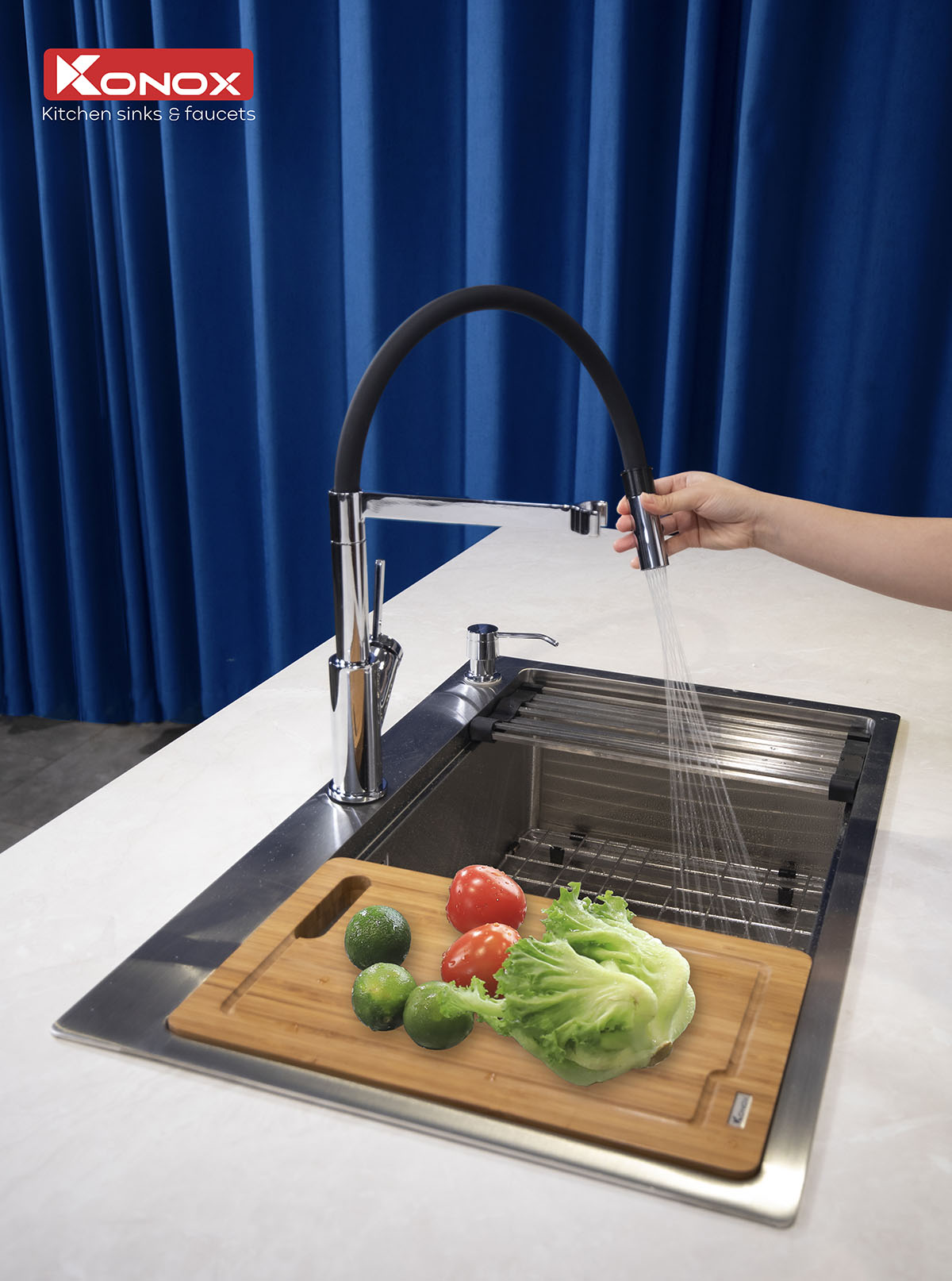 – Chức năng: Nóng lạnh + Rút dây + Đầu vòi khớp xoay + 2 chức năng Sprayer (Dòng chảy thắt eo, tạo bọt khí) + Xoay 360 độ