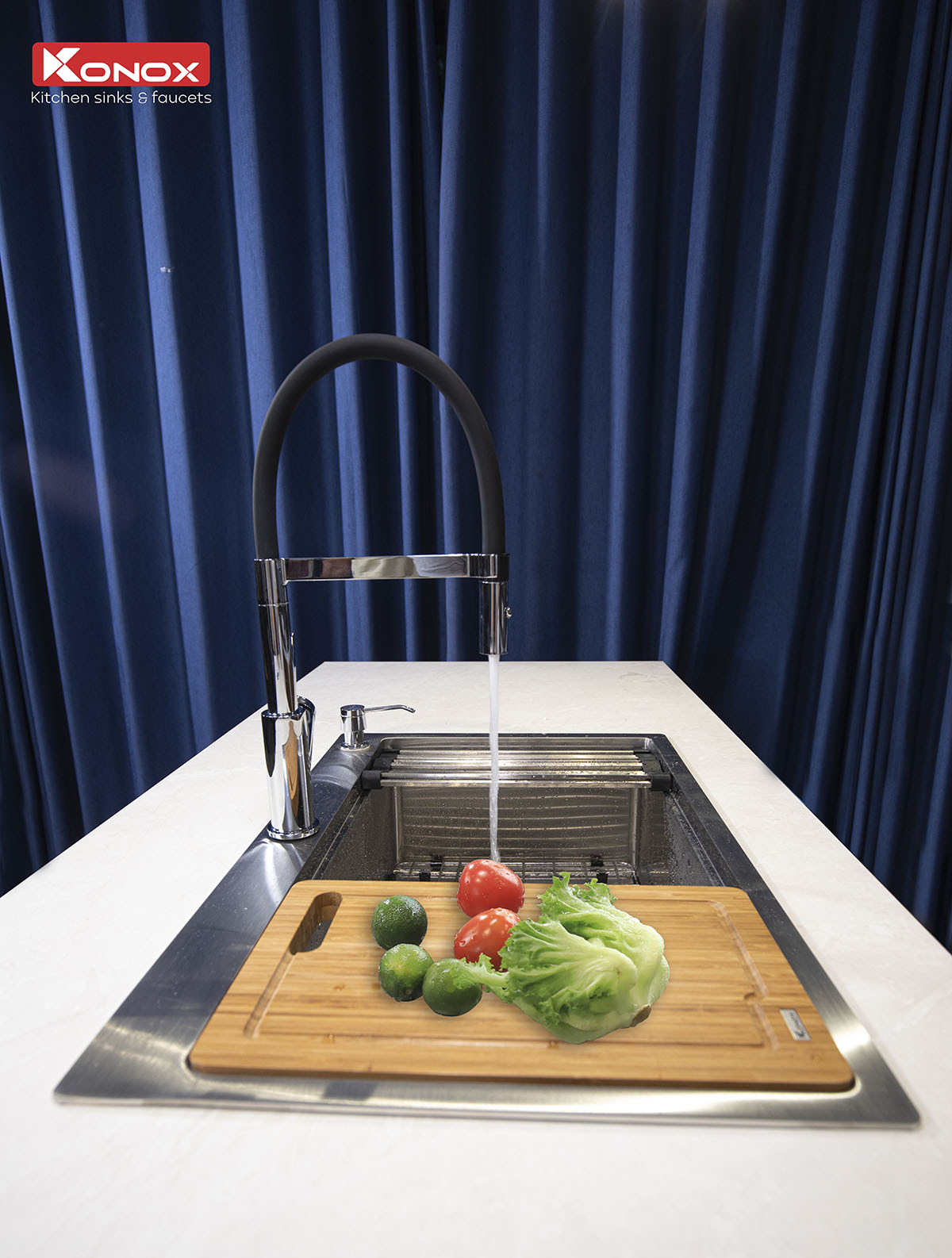 - Thiết kế đặc biệt với 1 đường nước vào và 2 đường nước ra (với 2 van nước riêng biệt) - Phù hợp với các chậu rửa chén bát 2 hộc (2 ngăn), chỉ